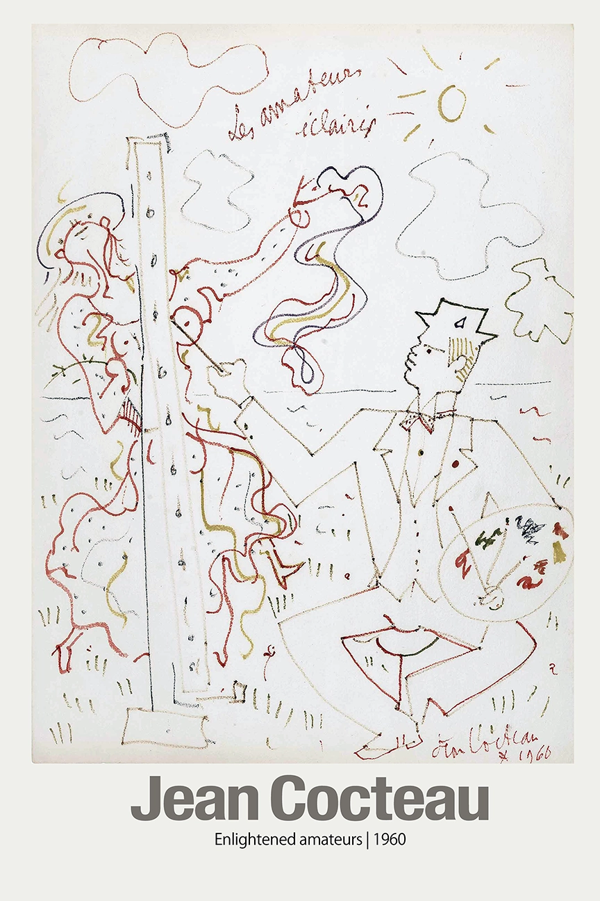 This Jean Cocteau print, titled “Enlightened amateurs” (Les amateurs éclairés) from 1960, provides a distinct glimpse into the late-period work of the renowned French polymath. The drawing utilizes minimalist linework to depict a whimsical scene of artistic creation, featuring a seated painter wearing a crown-like hat while holding a palette and brush. His muse stands gracefully by a tall easel, framed by a simplistic sky containing a singular sun and drifting clouds. This specific Jean Cocteau print serves as a visual record of the artist’s ability to convey complex themes of inspiration and dedication through sparse, rhythmic strokes.