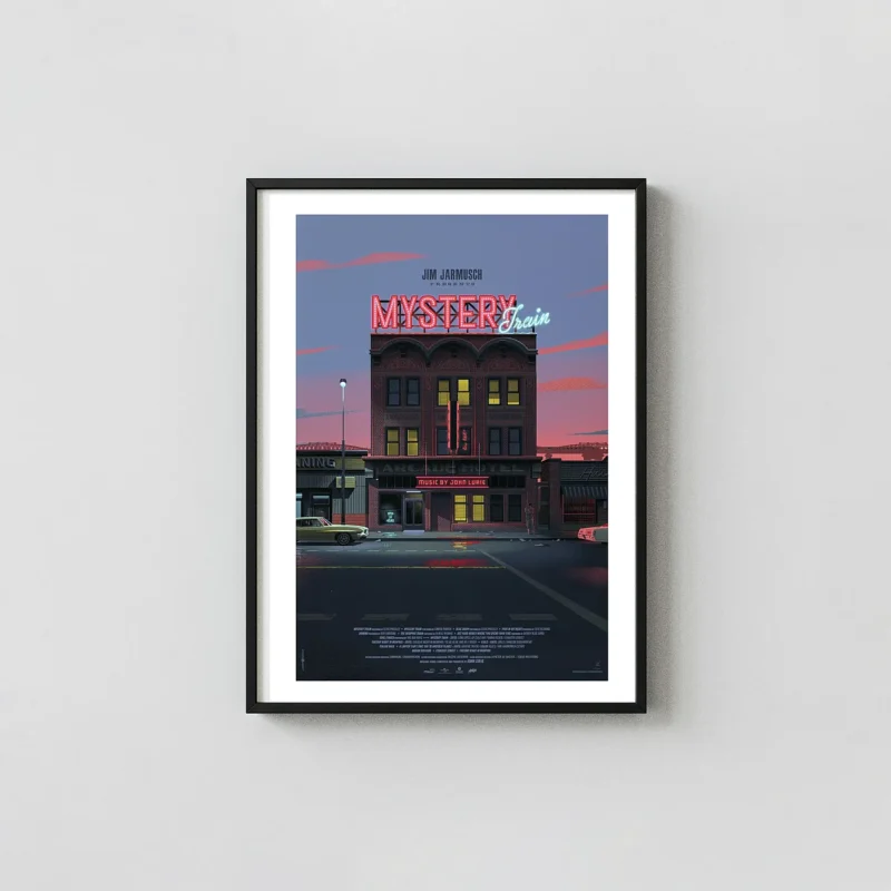 The focus is dramatically placed on the Arcade Hotel, the central hub where the film’s disparate characters converge. Durieux employs deep blues, crimson sunsets, and striking neon reds and cyans to set the scene. The iconic neon sign proclaiming “MYSTERY Train” stands against a moody sky, perfectly encapsulating the film’s blend of melancholy and cool rock-and-roll mystique. Notice the meticulously rendered details, from the vintage car parked on the street to the subtle textural effects that give the piece its unique, retro-modern appeal.