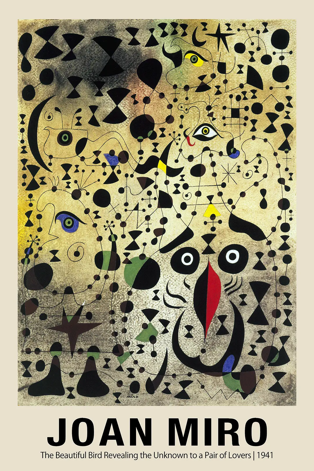 This Joan Miro Constellations print reproduces the visual complexity of the 1941 series titled The Beautiful Bird Revealing the Unknown to a Pair of Lovers. Originally conceived during a period of intense global conflict, this specific work represents a pivotal moment in twentieth-century abstract art. The composition utilizes a dense network of black lines and dots that interconnect various biomorphic forms, eyes, and celestial symbols against a mottled, atmospheric background. Every element is rendered with geometric precision, reflecting the artist’s focus on structured chaos and cosmic order.