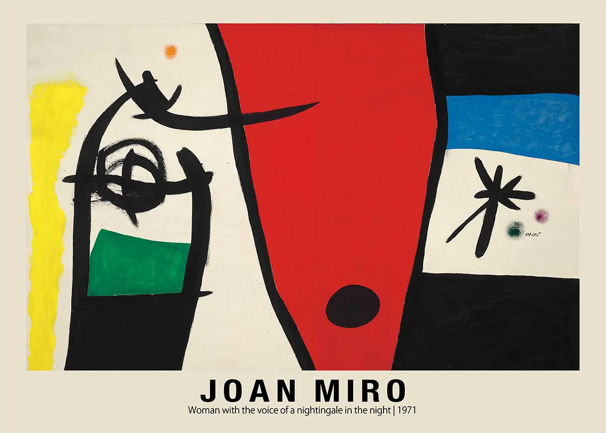 Owning a Joan Miro Poster allows collectors to bring the spirit of Catalan surrealism into a contemporary living space. This particular 1971 piece utilizes a heavy black calligraphic line that defines the boundaries of the abstract woman and the nightingale. These lines are not merely outlines but are thick, expressive strokes that carry the weight of the composition. On the right side of the print, a star-like symbol—a recurring motif in the artist’s career—sits within a white pane next to a block of blue, suggesting a night sky or a window into a different dimension. The interplay between these shapes creates a rhythmic balance that is characteristic of high-end Spanish abstract painting.