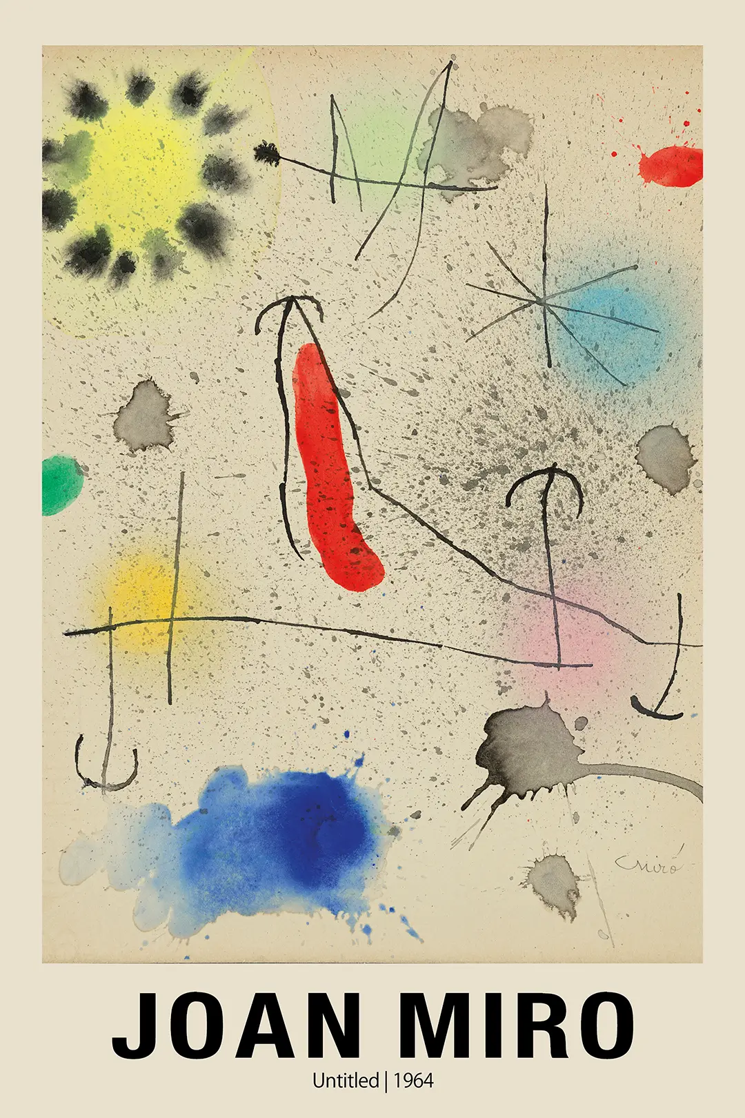 This Joan Miro poster displays the iconic 1964 Untitled composition with vibrant primary hues and ink-splatter textures. Each surrealist abstract art print is produced on museum-grade matte paper for a high-fidelity finish.