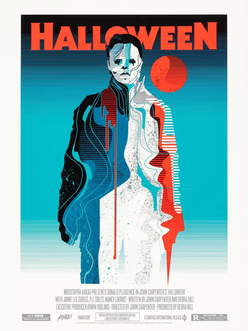 Experience the chilling dread of Haddonfield with this exceptional Mondo poster, celebrating John Carpenter’s seminal 1978 horror film, Halloween. This highly collectible piece was masterfully designed by the acclaimed art studio We Buy Your Kids (WBYK), offering a fresh, abstract interpretation of cinema’s silent killer, Michael Myers. The design employs a stark contrast between cool tones (teal, aqua, and black) and explosive neon orange, capturing the raw, relentless energy of The Shape’s reign of terror.
