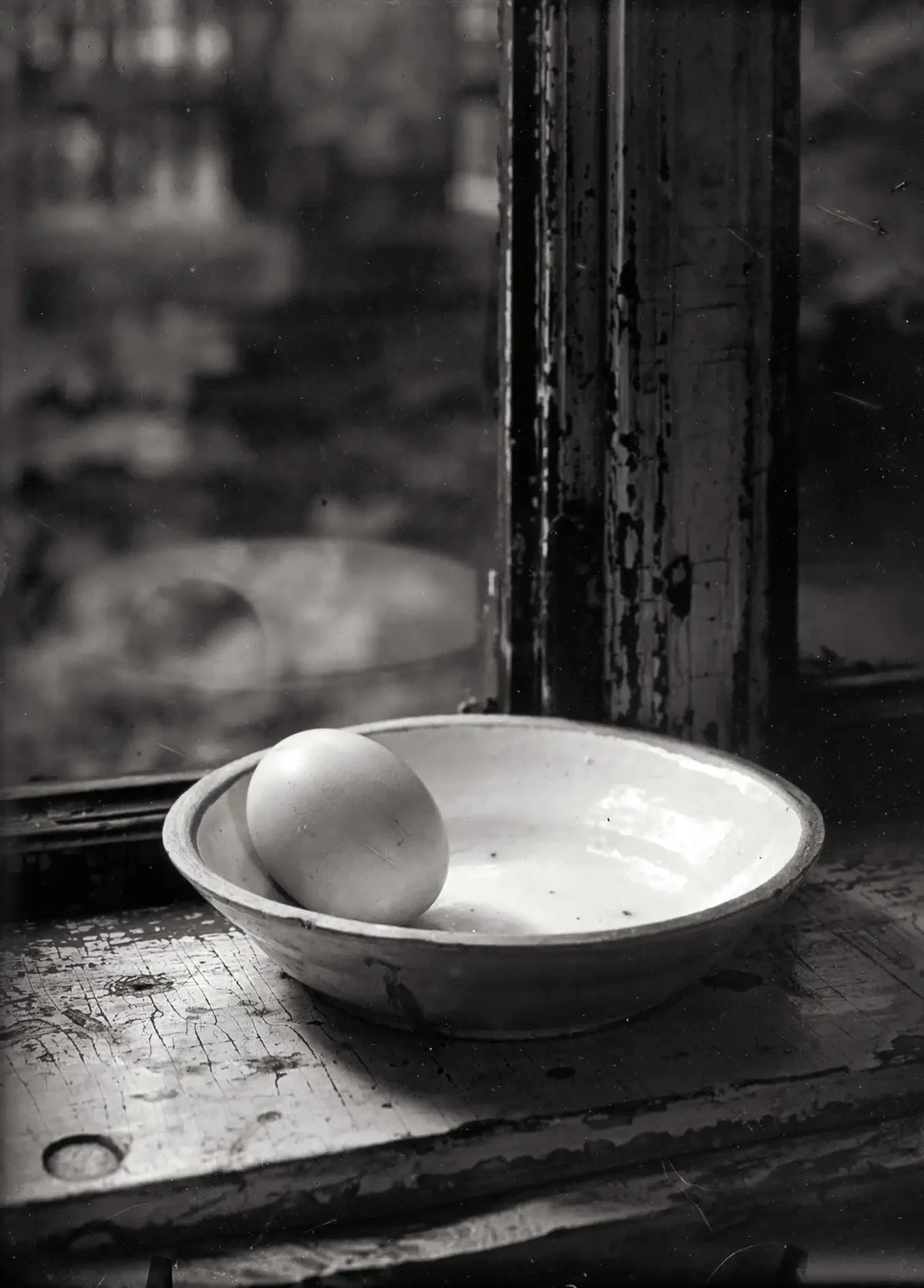 This Josef Sudek print places a single egg in a bowl and makes it the subject of one of the most quietly luminous still life photographs in the history of the medium — light falling across the curve of the shell with the precision and tenderness Sudek brought to every object he photographed.