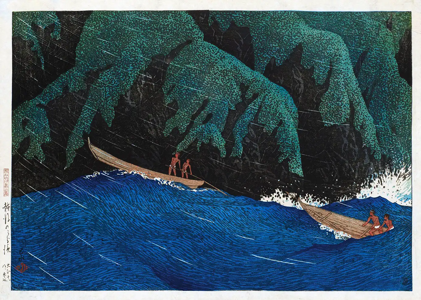 Kawase Hasui was a master of light and weather, often spending months traveling across Japan to capture specific locales. In this Kawase Hasui Urahama print, the artist emphasizes the scale of the natural world. The jagged cliffs rise abruptly from the water, their surfaces textured with varying shades of green and black to suggest moss and wet stone. The fishermen in their slender wooden crafts appear small yet resilient against the churning tides. This specific work is part of his ‘Souvenirs of Travel’ series, which remains highly sought after by collectors of vintage Japanese woodblock art.