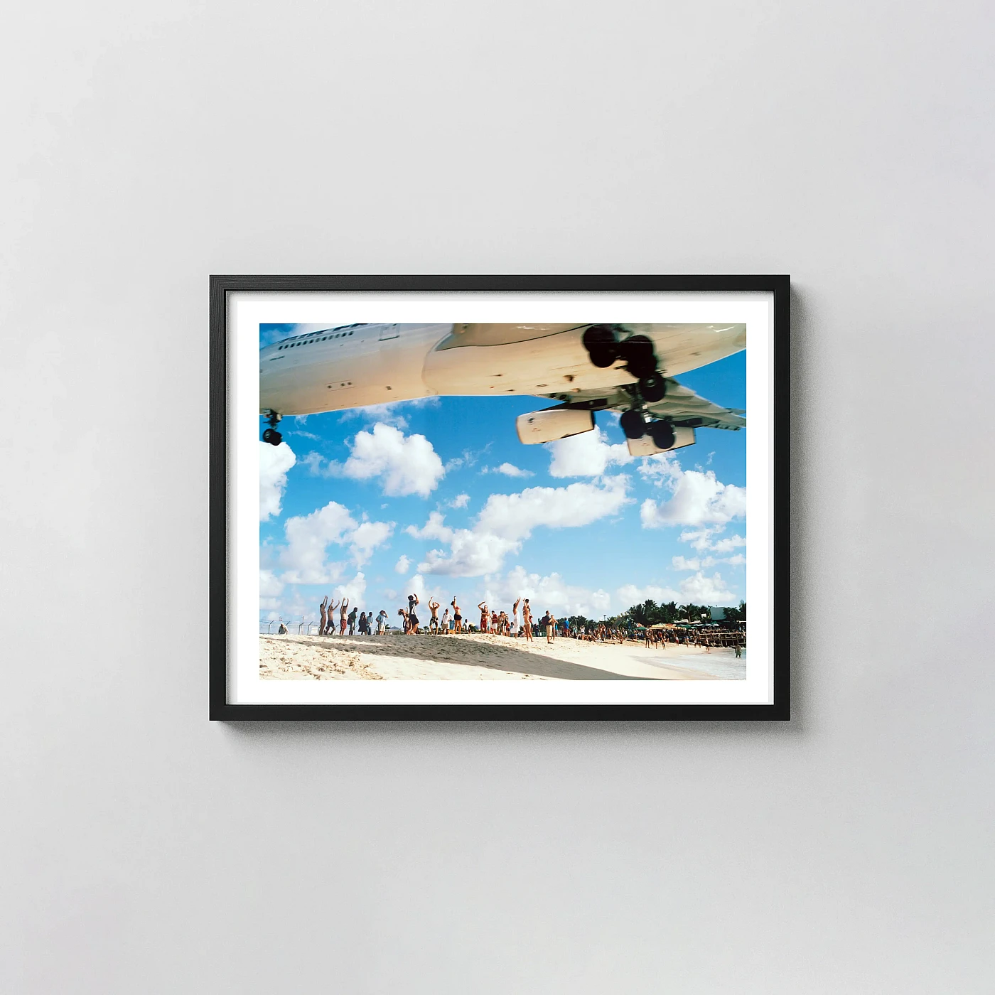 This Kevin Cooley print documents one of the world’s most photographed aviation phenomena — the low-altitude final approach over Maho Beach at Princess Juliana International Airport, St. Maarten, where arriving aircraft pass directly over sunbathers at rooftop height. Cooley’s 2007 Air France image captures the moment with the formal precision and compositional clarity that elevates it above casual documentation. This airplane landing photo is aviation wall art made by a fine art photographer, not a spotter — and the difference shows. This Kevin Cooley print is beach airplane art at its most graphically powerful.