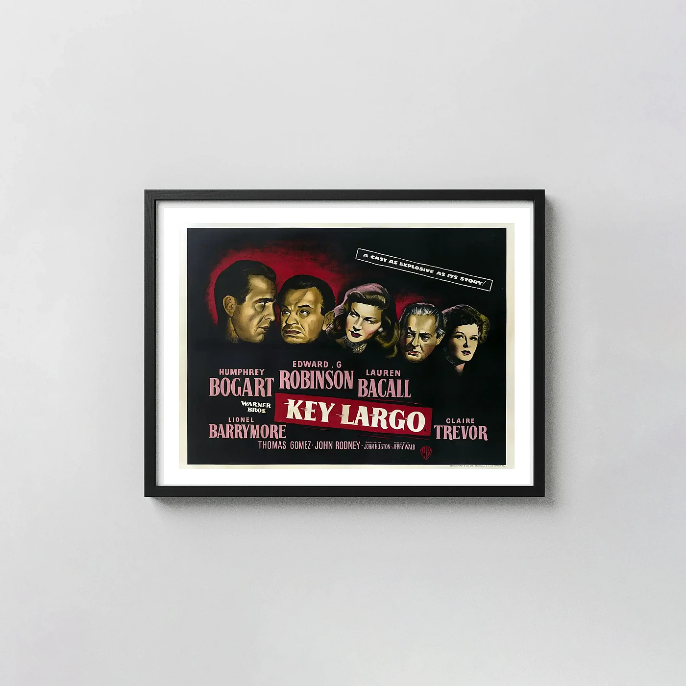 Relive the 1948 classic with this Key Largo Movie Poster featuring Bogart, Bacall & Robinson. Premium quality, museum-grade wall art print. Perfect gift for film noir fans.