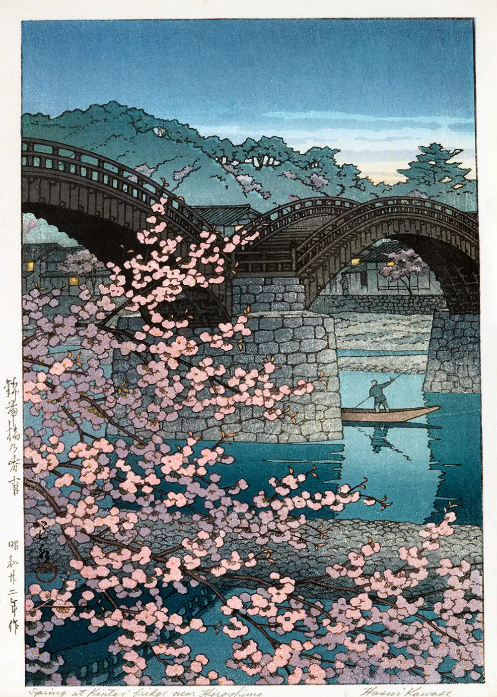 The Kintaikyo Bridge print illustrates a moment of tranquility within the Showa period. The bridge itself, originally constructed in 1673, is a symbol of Japanese engineering and resilience. In this woodblock reproduction, the heavy stone foundations provide a sense of permanence against the fleeting nature of the spring blossoms. Kawase’s mastery is evident in the subtle gradations of color, particularly the transition of blue in the sky and the way the shadows fall beneath the wooden spans. To the right, a solitary figure in a small river boat provides a human scale to the vast landscape, emphasizing the harmony between man and nature. The background features traditional Japanese houses and the verdant slopes of Mount Yokoyama, where the Iwakuni Castle stands.