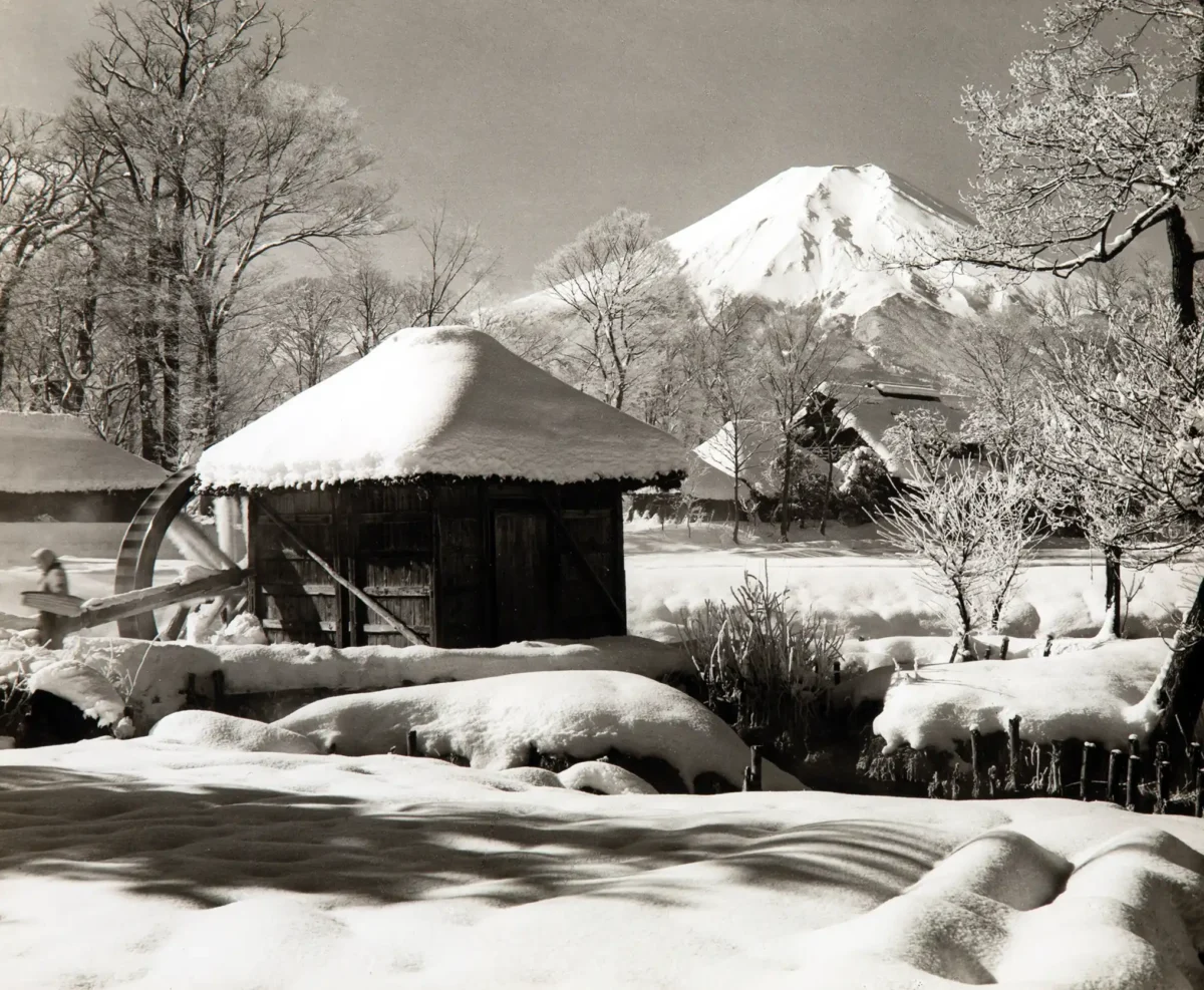Bring the tranquil majesty of classic Japanese photography into your home with this stunning Koyo Okada poster. Known as the foremost photographer of Mount Fuji, Okada captured this timeless scene featuring the iconic snow-capped peak towering over a rustic, snow-covered watermill. The high-contrast black and white composition emphasizes the depth and texture of the deep winter landscape, offering a powerful, yet peaceful, piece of wall art perfect for minimalist or traditional decor themes. This vintage print honors the artistry of one of Japan’s most influential landscape photographers.