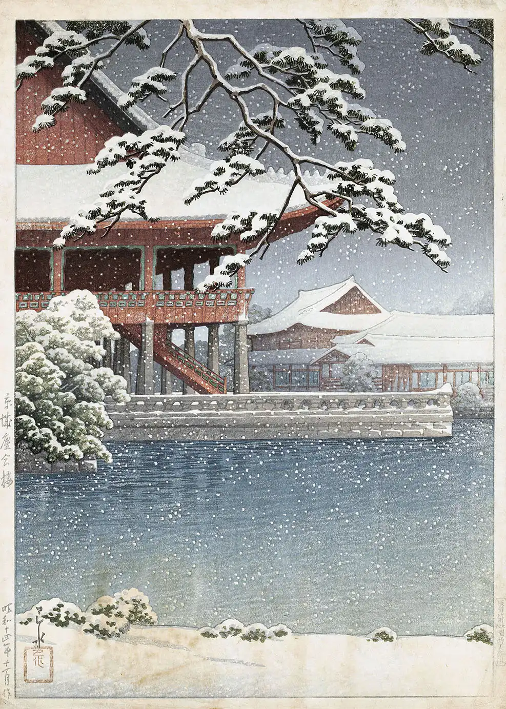Observers will note the high-contrast relationship between the dark, pine needles and the white accumulation of snow. The lower foreground features small, snow-dusted shrubs that lead the eye toward the expansive water surface, which reflects the somber, overcast sky of a Korean winter. Owning a Kyojo Keikaro print allows for a scholarly appreciation of how Hasui balanced the rigid geometry of man-made structures with the fluid, unpredictable nature of a snowstorm.