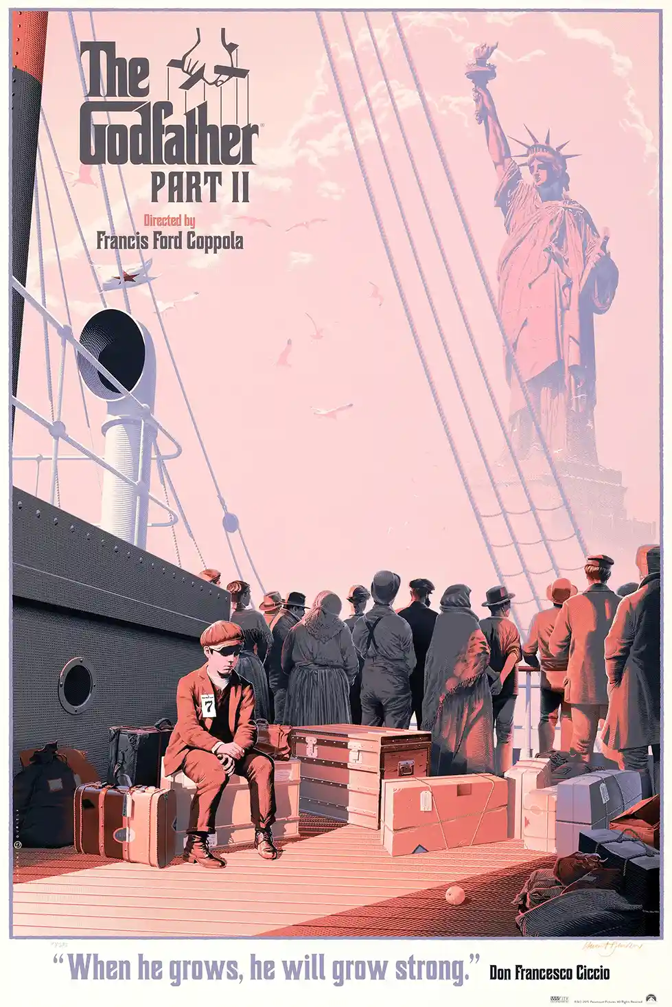 Step into the dramatic origins of the Corleone family with this breathtaking alternative movie poster for The Godfather Part II, created by the renowned Belgian artist Laurent Durieux. Unlike traditional posters, Durieux captures the film’s poignant flashback sequences, specifically the powerful moment young Vito Andolini arrives at Ellis Island, as referenced by the quote: “When he grows, he will grow strong.”
