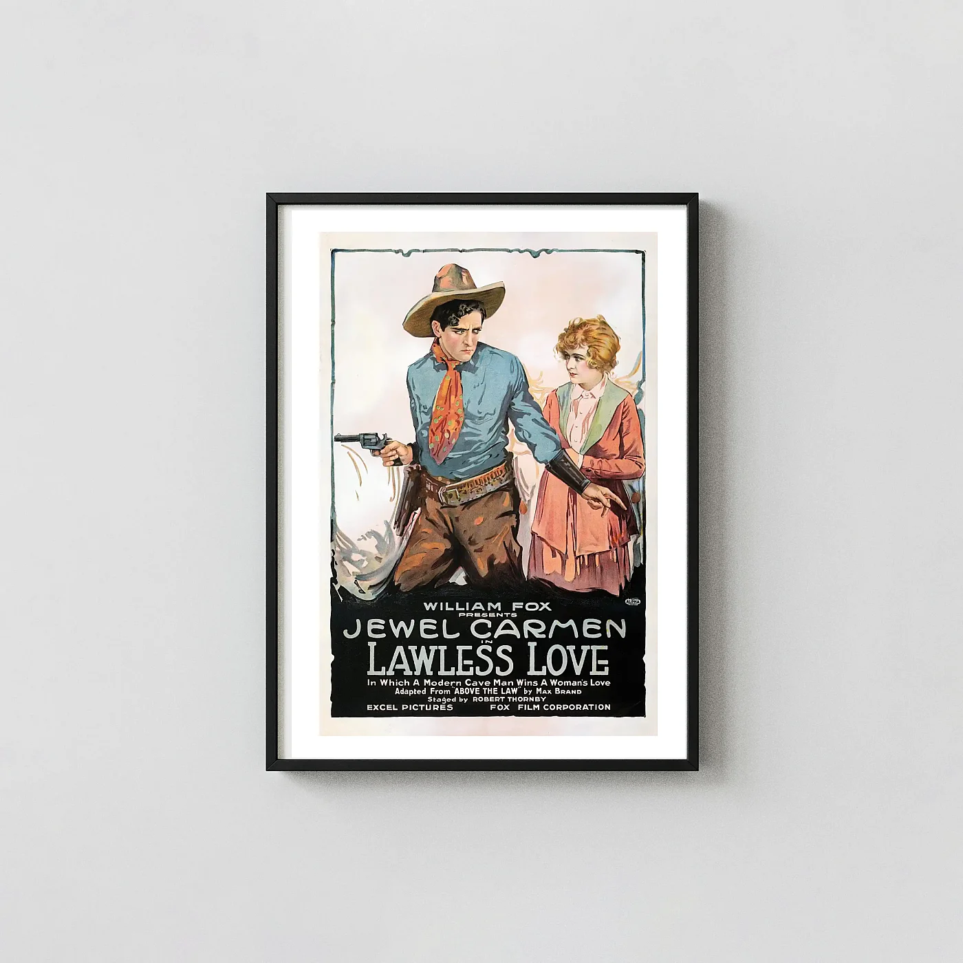 Own a piece of cinema history with this stunning reproduction of the 1918 Lawless Love movie poster starring Jewel Carmen. Perfect vintage Western decor.