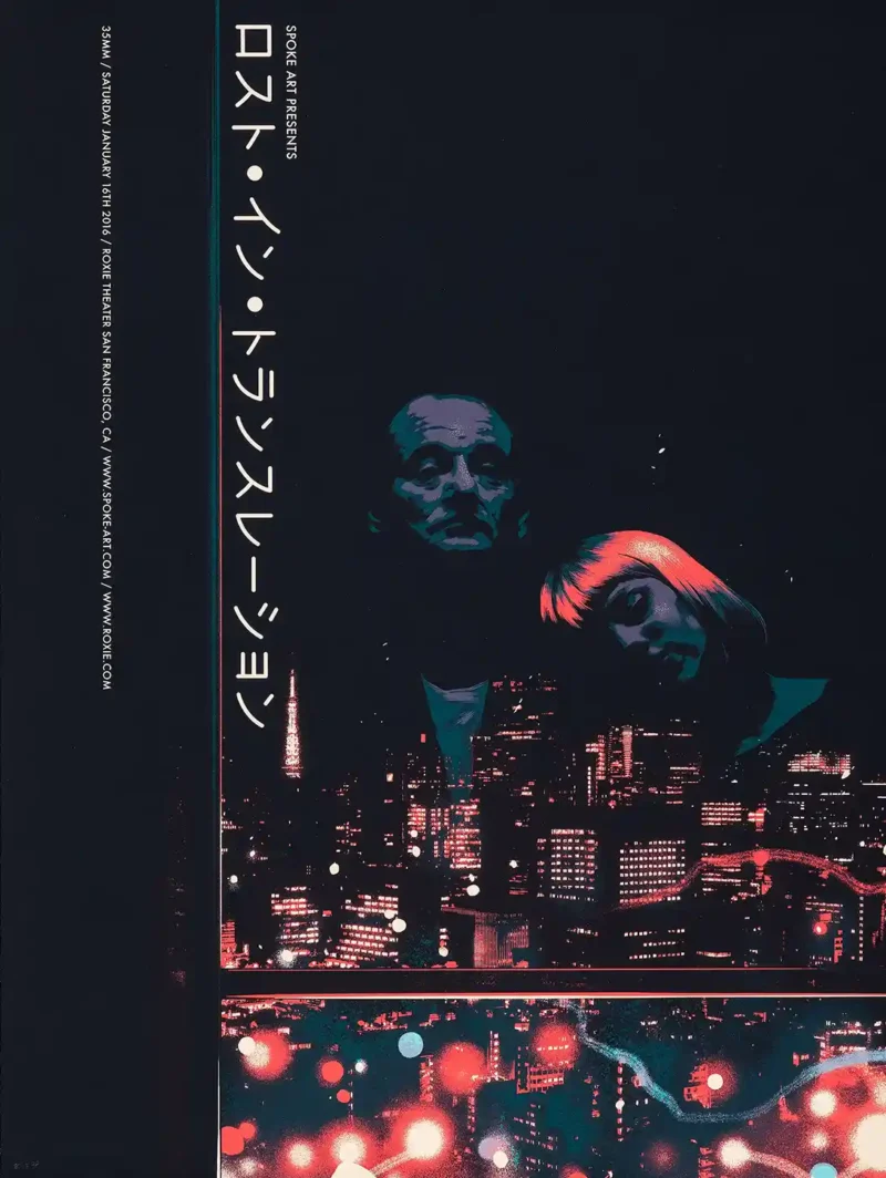 Immerse yourself in the quiet, atmospheric beauty of Tokyo with this stunning alternative movie poster for *Lost in Translation*. Designed by acclaimed artist Matt Taylor for a Spoke Art gallery show, this print captures the essence of Sofia Coppola’s Academy Award-winning film. The artwork features a breathtaking view of the city’s neon-lit skyline, dominated by deep blacks and subtle pops of moody teal and striking red—the perfect encapsulation of the film’s nocturnal isolation and intimate moments.