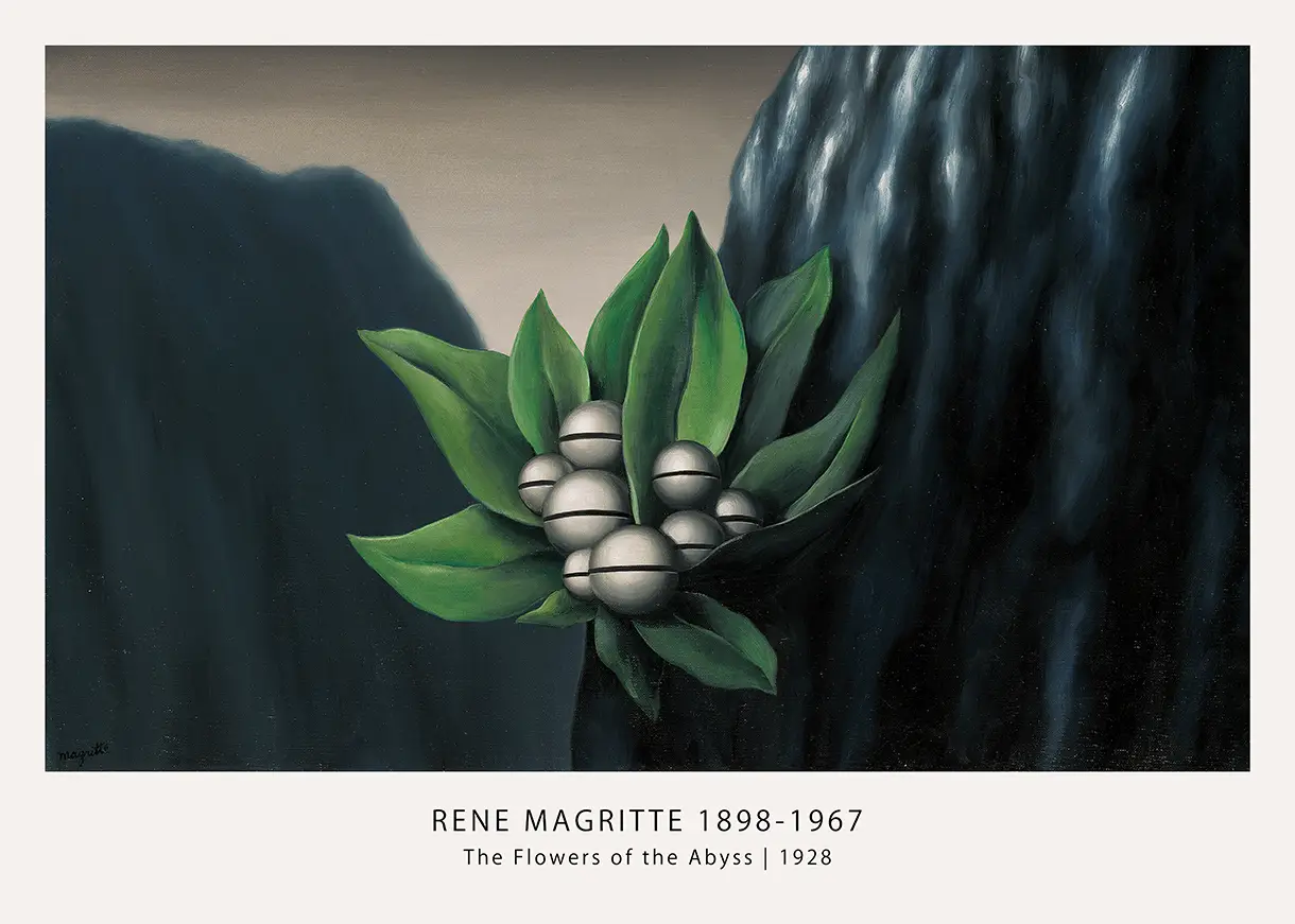 The Magritte Abyss Poster captures the eerie stillness and psychological depth of the 1928 original painting, titled Les Fleurs de l’abîme. This specific reproduction utilizes professional archival-quality methods to preserve the high-contrast relationship between the dark, craggy mountains and the vibrant green foliage in the foreground. Central to the composition are the silver spheres, often identified as jingle bells or grelots, which appear frequently throughout the artist’s early surrealist period. By choosing a Magritte Abyss Poster, you are bringing a pivotal moment of Belgian surrealism into your home environment.