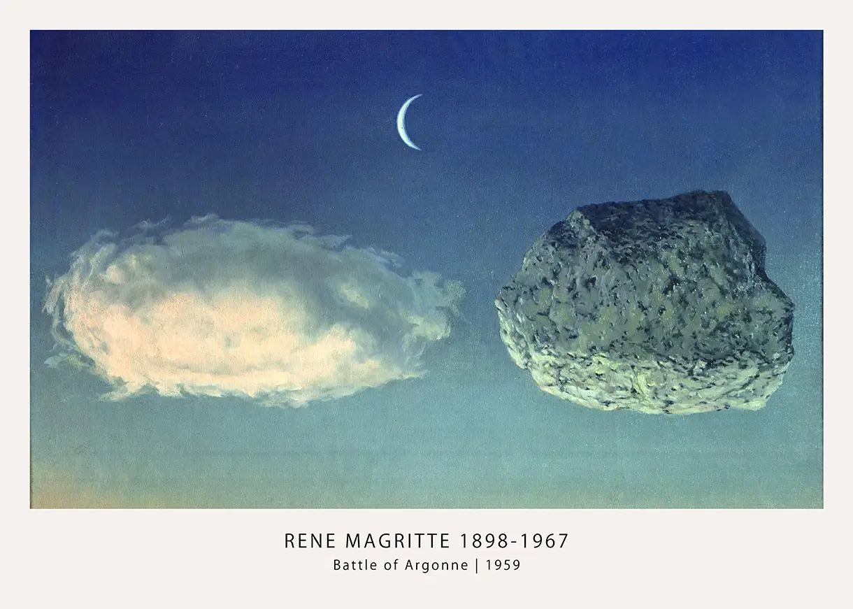Magritte Battle of Argonne reproduces the 1959 surrealist scene featuring a weightless boulder beside a dense cloud. This Belgian surrealism poster is produced on 200 GSM museum-grade matte paper for a glare-free finish.