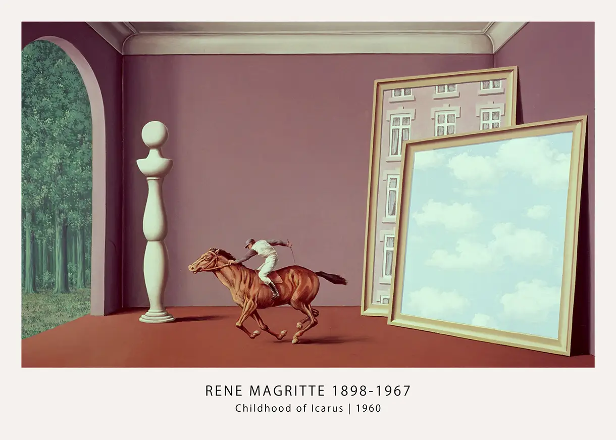 This Magritte Childhood of Icarus print features a jockey riding through a surreal interior with a forest view. The Belgian surrealism poster is produced on 200 GSM museum-grade matte paper for a flat, glare-free finish.