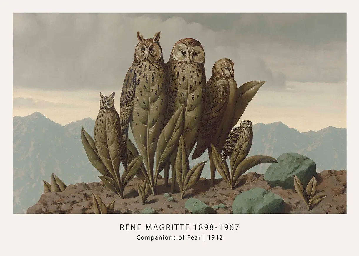 In the early 1940s, Magritte began experimenting with the concept of metamorphosis and the unexpected juxtaposition of disparate elements. In this Magritte Companions of Fear composition, the artist challenges the viewer’s perception of reality by merging the predatory nature of the owl with the fragile, stationary existence of a leaf. This specific leaf owl painting print reflects the tension and anxiety of the Second World War, a period where the familiar world felt increasingly alien and precarious. The title itself suggests a shared experience of dread, symbolized by the grouping of these watchful, stationary creatures who seem both part of the woods and separate from them.