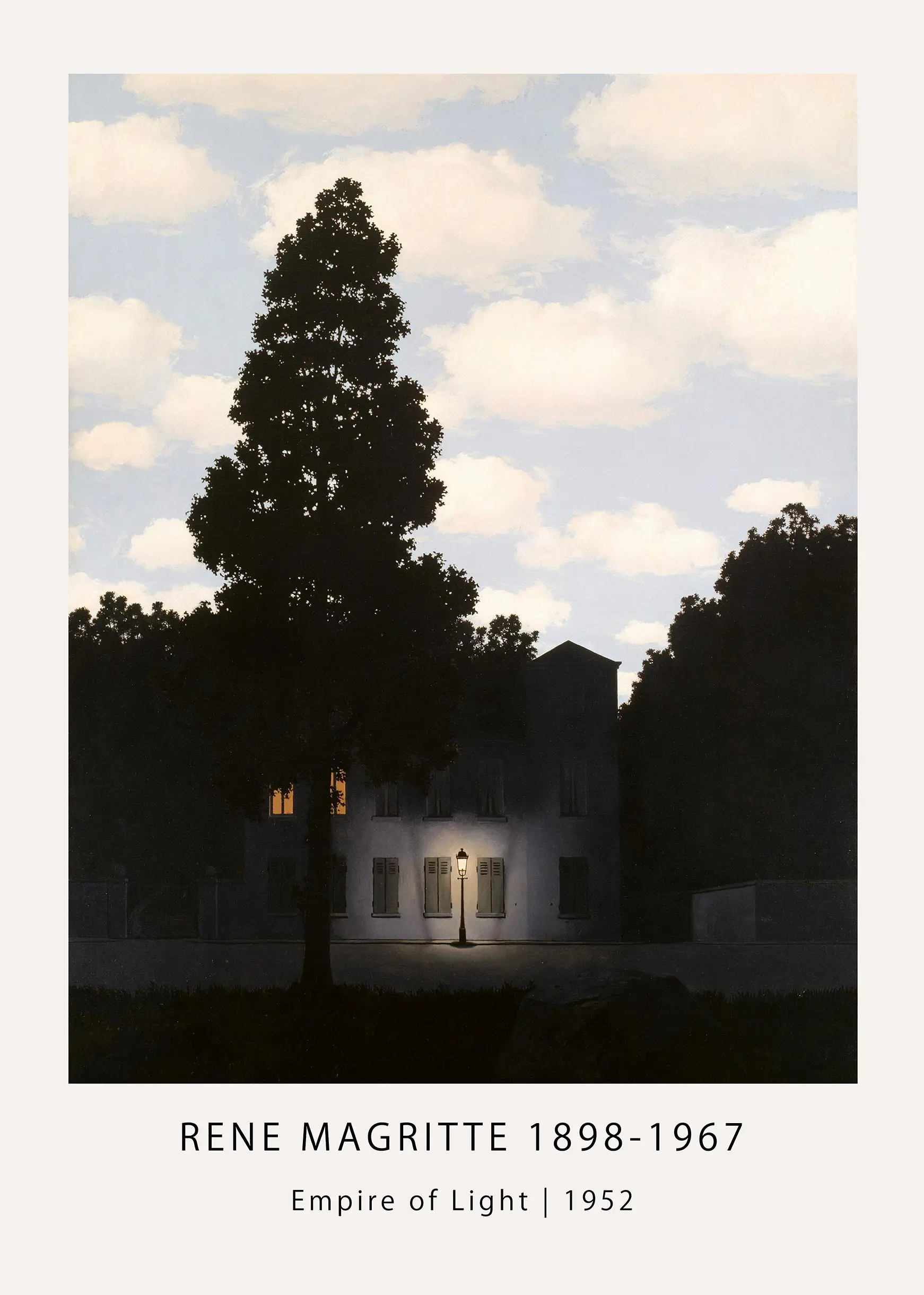The Magritte Empire of Light print captures the jarring juxtaposition of a sunlit sky filled with cumulus clouds against a darkened suburban street. This 1952 work by René Magritte challenges the viewer’s perception of reality by merging two incompatible temporal states within a single frame. The lower half of the composition is shrouded in the deep shadows of night, where a lone street lamp provides a singular glow against the facade of a silent house. Above this nocturnal scene, the sky remains a bright, midday blue, creating a visual paradox that defines the surrealist movement. The contrast between the illuminated upper half and the shadowed lower register produces a psychological tension characteristic of Belgian surrealist thought.