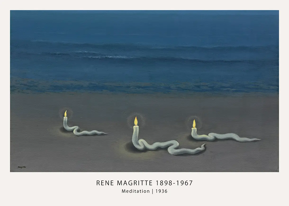 The Magritte Meditation print offers a window into the mind of Belgian surrealist René Magritte, specifically during his prolific period in 1936. This work, titled Meditation, deviates from traditional nautical themes by introducing three glowing, serpent-like candles that appear to crawl across the damp sand of a beach. The dark, navy blue ocean in the background meets a gray sky, creating a somber yet intriguing environment that focuses entirely on the soft glow of the flames. This specific Magritte Meditation print is a faithful reproduction of the original oil on canvas, preserving the subtle textures and brushwork characteristic of the artist’s mid-career style.