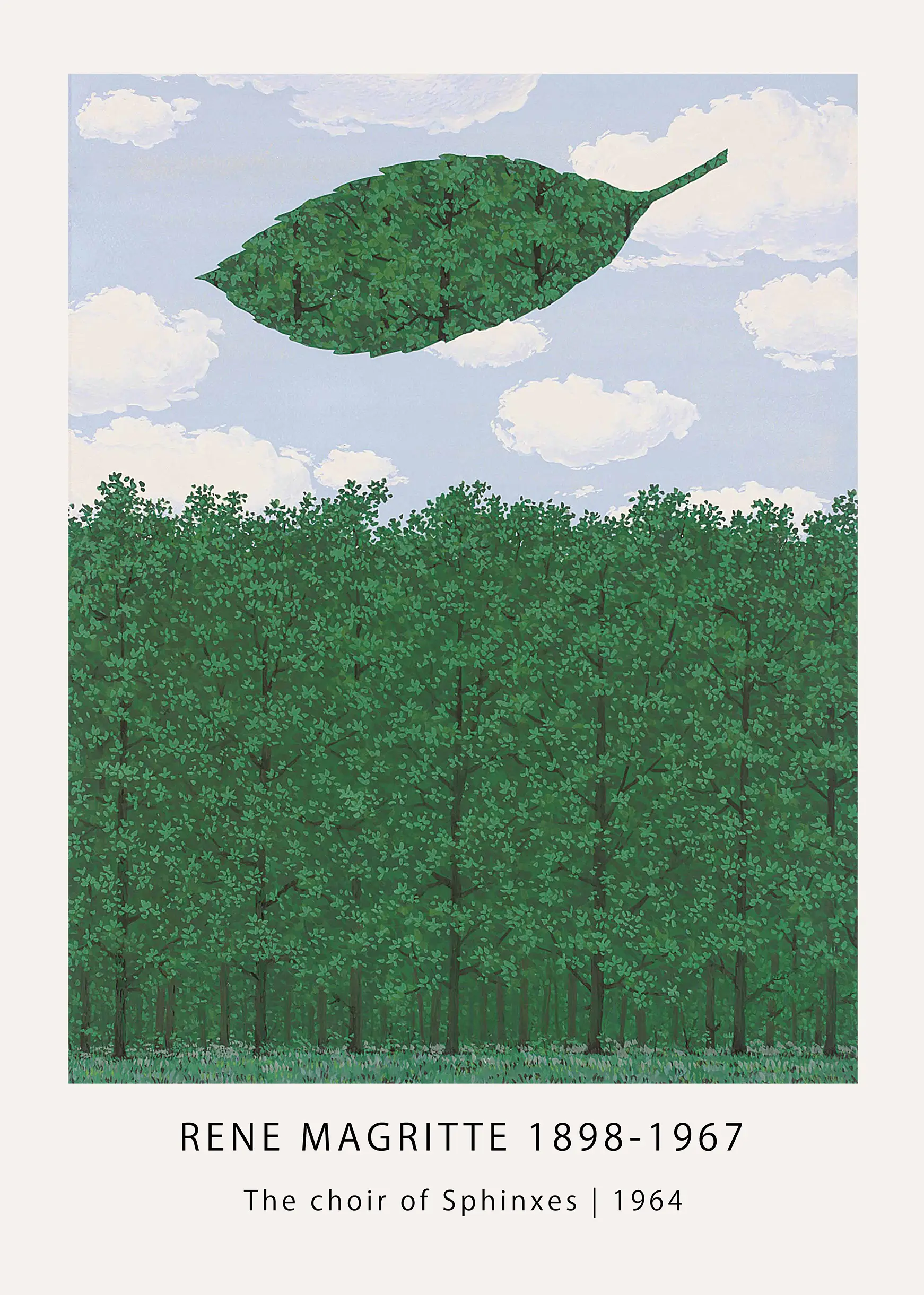 The **Magritte Sphinxes print** reproduces René Magritte’s 1964 work, “Le choeur des sphinx,” with exceptional fidelity to the original surrealist vision. The composition features a repetitive, dense arrangement of deciduous trees that form a solid green wall across the lower two-thirds of the frame. Above this organic boundary, a single, massive leaf floats suspended in a pale blue sky dotted with soft white clouds. Within the silhouette of this giant leaf, the same forest texture is meticulously replicated, creating a recursive visual puzzle that challenges the viewer’s understanding of scale and reality. This significant **1964 Art** work exemplifies Magritte’s fascination with hidden meanings and the juxtaposition of ordinary objects in extraordinary circumstances.