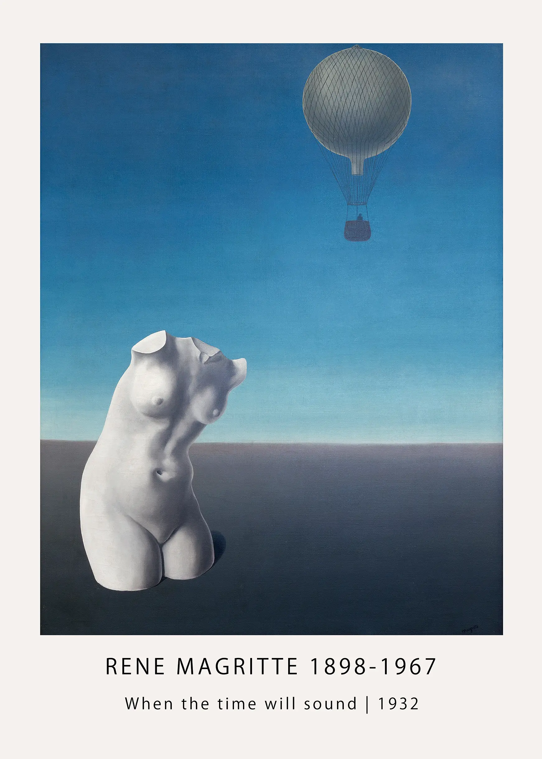 This Magritte Surrealist Poster reproduces the 1932 composition titled ‘When the time will sound,’ a significant work from the height of the Belgian artist’s career. This specific piece explores the relationship between objects, space, and the observer’s perception, featuring a meticulously rendered marble torso juxtaposed against a serene cerulean sky. The presence of a solitary hot air balloon in the upper quadrant provides a sense of quietude and mystery, characteristic of the movement. By placing a Magritte Surrealist Poster in your collection, you bring the philosophical inquiries of the 20th-century avant-garde into your living environment.