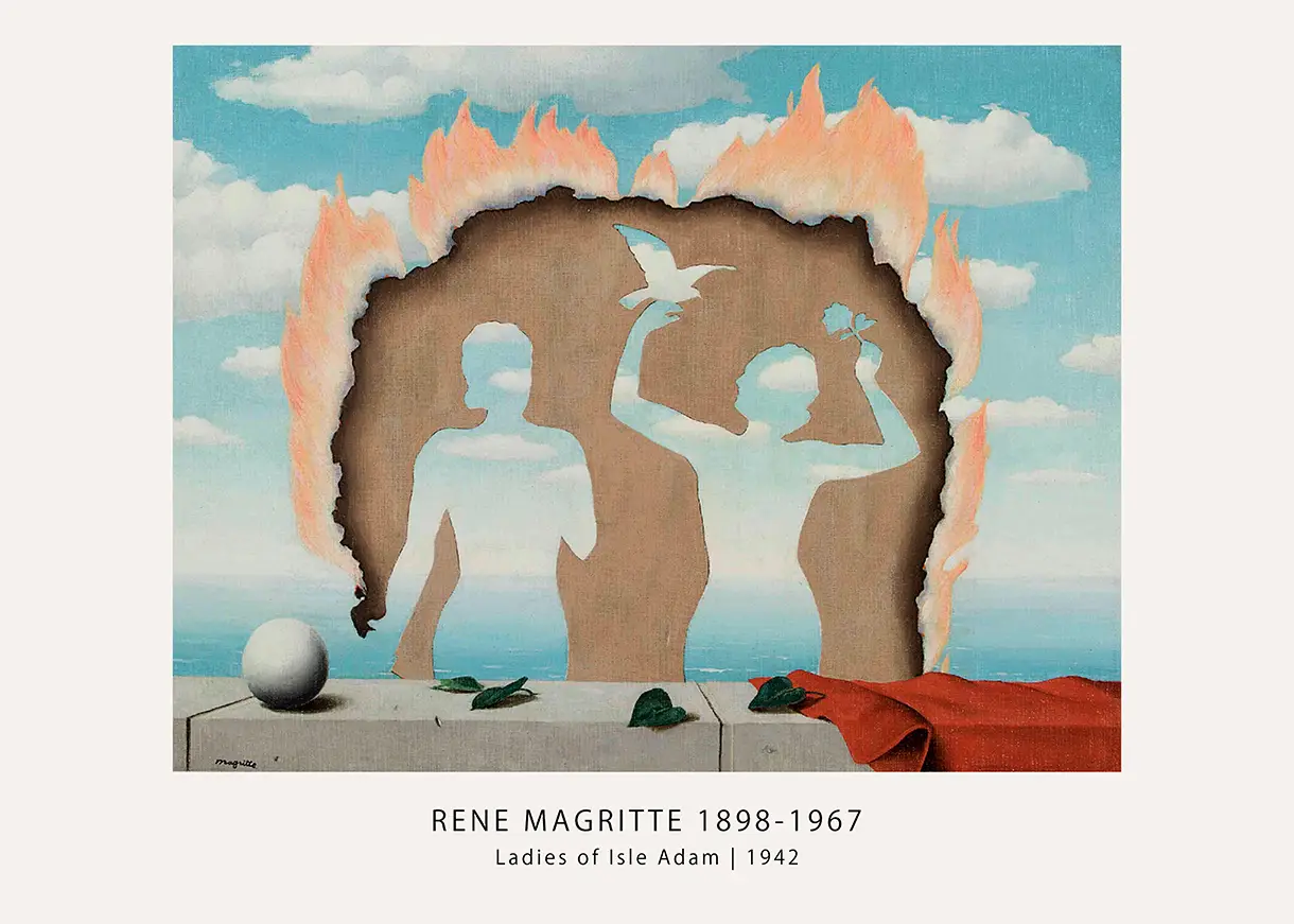The central figures are two female silhouettes, their forms defined not by lines or color, but by the absence of the burning foreground. These silhouettes act as windows into a different reality, mirroring the cloud-filled sky behind them. One figure holds a white bird, which sits calmly on her hand, while the other figure holds a small, delicate rose. This 1940s modern art poster captures the essence of Magritte’s play with perception, where the interior and exterior worlds collide. The use of the picture within a picture technique is a hallmark of Belgian surrealism wall art, challenging the observer to question the physical boundaries of the canvas. This specific Magritte Surrealist Print utilizes 1942 Art elements to create a sense of mystery in any Wall Decor arrangement.