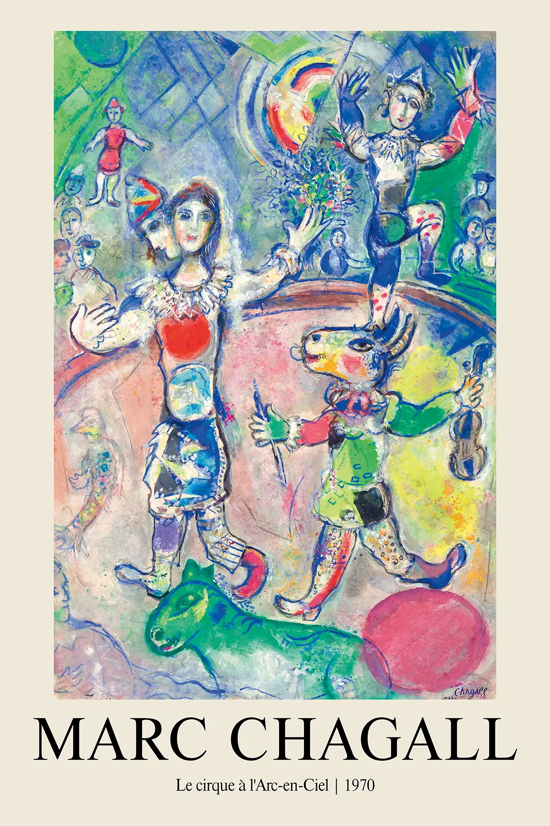 The Marc Chagall circus poster serves as a definitive example of the artist’s enduring fascination with the theatrical world of the big top. Created in 1970, this specific composition, titled Le cirque à l’Arc-en-Ciel, captures the ethereal and dream-like qualities that defined Chagall’s later years. The visual narrative is structured around a central arena where human figures and anthropomorphic animals coexist in a weightless, chromatic environment. By integrating a Marc Chagall circus poster into your collection, you are securing a piece of art history that bridges the gap between traditional folk motifs and French modernism.