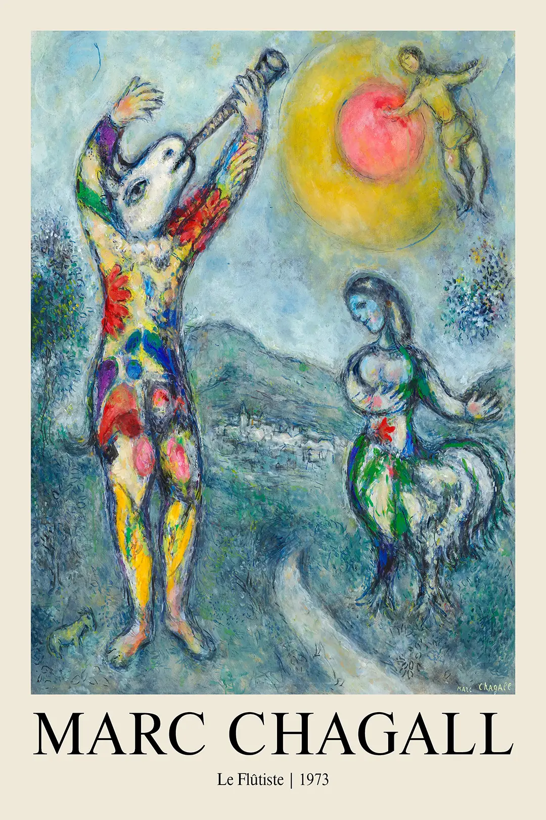 Marc Chagall Le Flûtiste is a 1973 lithographic work featuring dreamlike imagery and mythical figures in a stippled blue environment. This 1970s modern art print is produced on 200 GSM museum-grade matte paper for professional longevity.