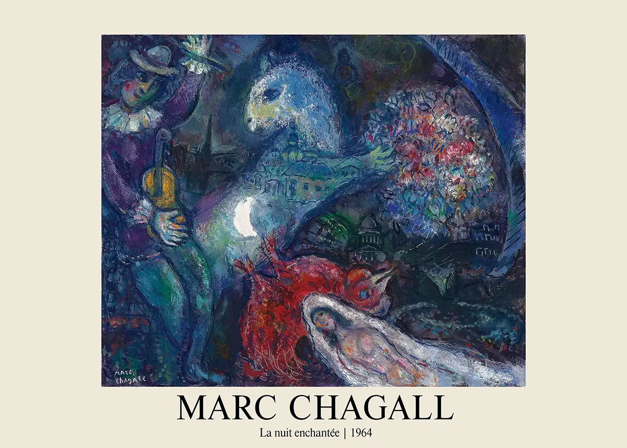 This Marc Chagall poster presents a faithful reproduction of the 1964 work, La Nuit Enchantée, a piece that epitomizes the artist’s fascination with dream logic and nocturnal symbolism. The composition is anchored by a deep, monochromatic blue palette that suggests a world suspended between sleep and reality. In the foreground, a violinist dressed in purple and teal hues cradles his instrument, a recurring motif in Chagall’s work that pays homage to his Hasidic roots and the musical traditions of Eastern European village life.