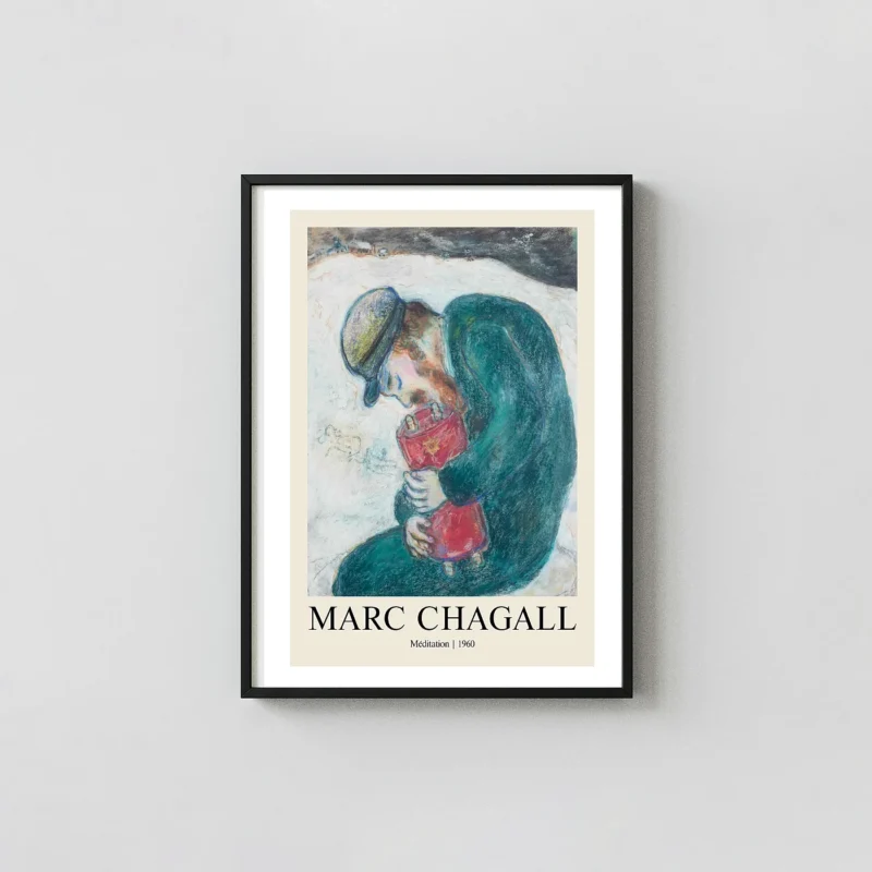 This Marc Chagall poster captures the quiet, spiritual intensity of the 1960 work Méditation, a poignant exploration of faith, identity, and the artist’s own cultural roots. The composition centers on a bearded figure, likely a reflection of the Hasidic community that influenced the artist throughout his life. Wrapped in a heavy, dark teal coat and wearing a simple flat cap, the man bows his head in a moment of deep prayer or contemplation. He holds a crimson Torah scroll tightly against his chest, the gold Star of David shimmering against the rich red fabric. This Marc Chagall poster brings the textured, almost palpable brushstrokes of the original piece into your personal collection, maintaining the integrity of every line and shade.