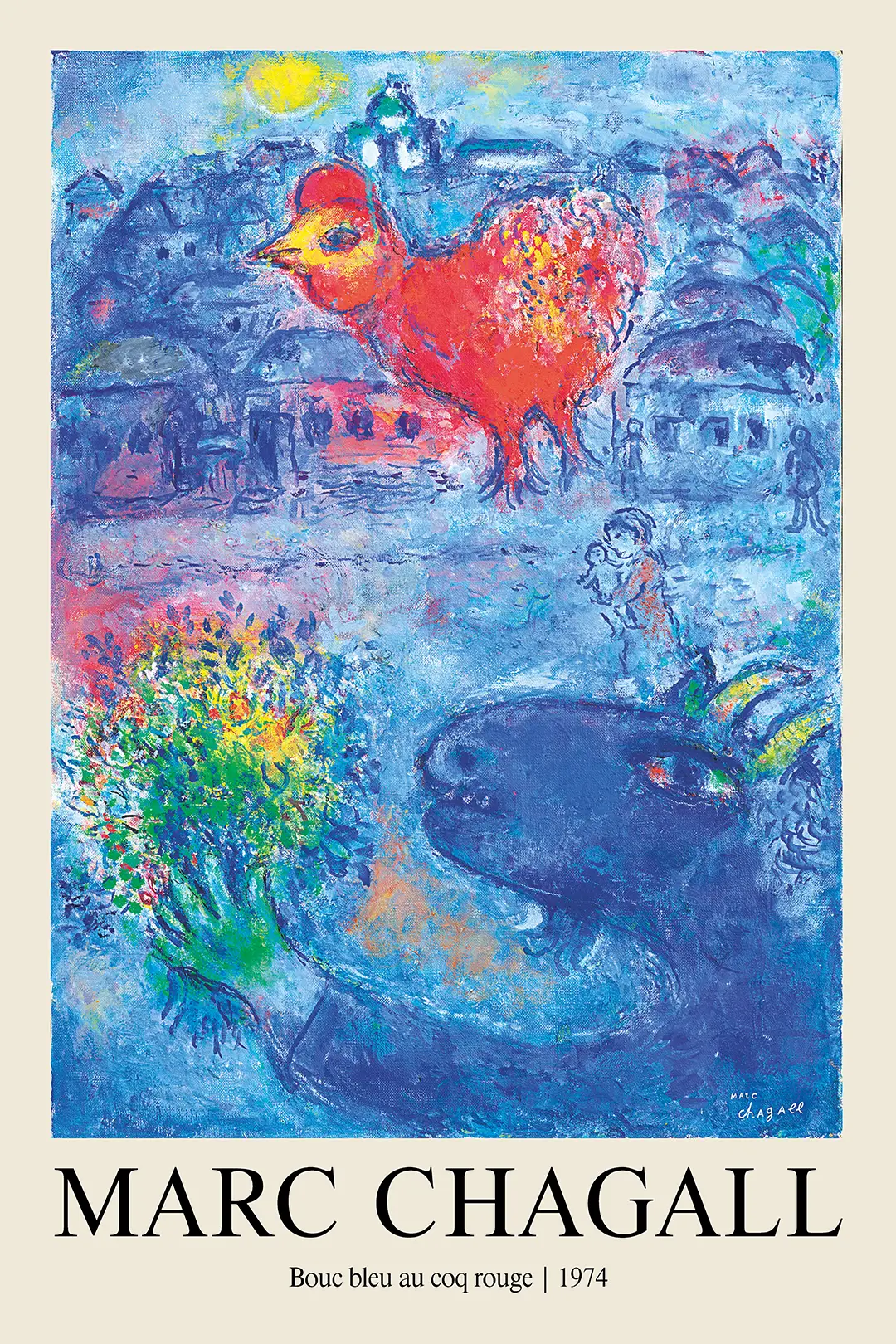 This Marc Chagall print reproduces the 1974 work titled Bouc bleu au coq rouge, capturing the vivid color palette and floating dream-like figures characteristic of the artist’s later period. The composition is anchored by a deep cobalt blue goat in the lower foreground, which looks upward toward a large, textured red rooster hovering above a village. The background contains a dense arrangement of small houses, reminiscent of a Belarusian shtetl, rendered in varied shades of azure, violet, and pale blue. A figure holding a small child stands in the middle ground, while a vibrant bouquet of green and yellow flora provides a focal point of high contrast on the left side. Each element contributes to a narrative of memory and folklore common in high-end modernist surrealism art.
