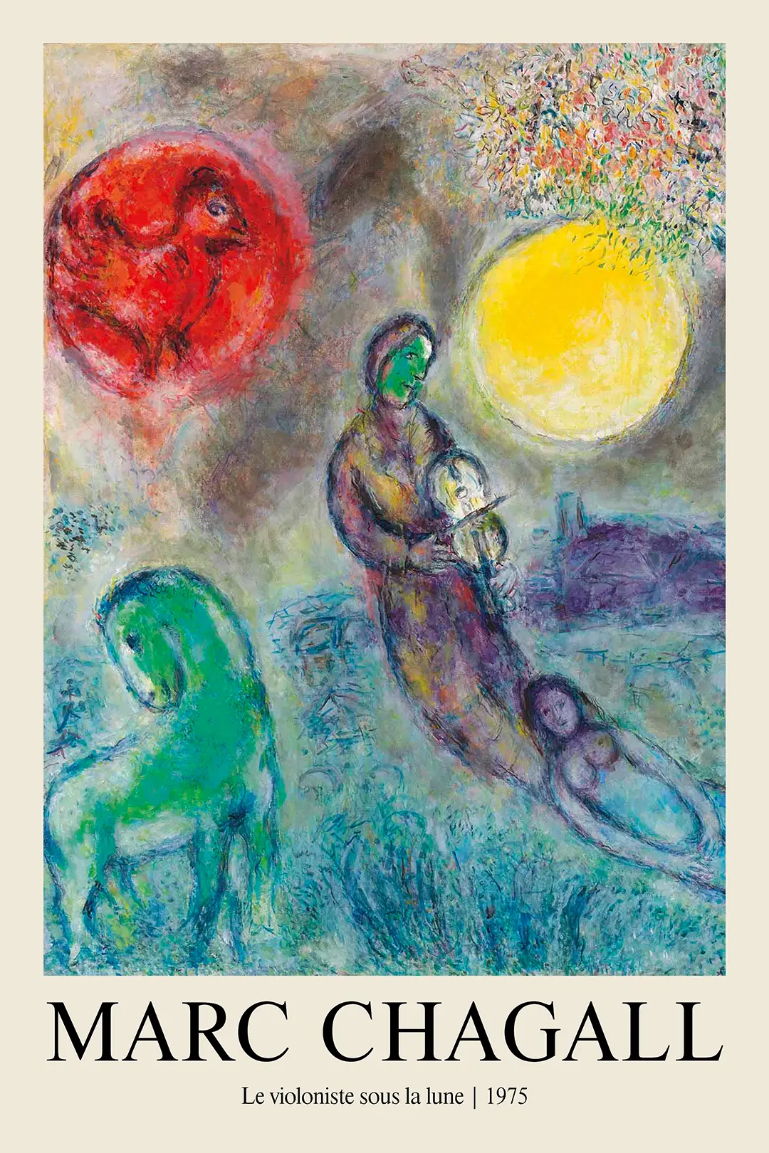 This Marc Chagall print showcases the 1975 surreal dreamscape titled Le violoniste sous la lune. This modernist violin wall art is reproduced on 200 GSM museum-grade matte paper for lasting color.
