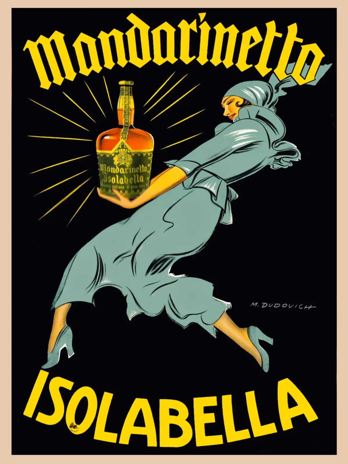 Marcello Dudovich (1878–1952) was renowned for his ability to infuse commercial subjects with intense sophistication and dramatic flair. This particular design, promoting the classic Italian mandarin liqueur Isolabella, exemplifies his signature style. The composition features a striking, fashionable woman, often referred to as a Dudovich woman, caught in a dynamic pose, elegantly presenting the glowing orange bottle of Mandarinetto against a stark, black void. The vivid yellow text and radiating lines emphasize the product’s luminosity and luxury.