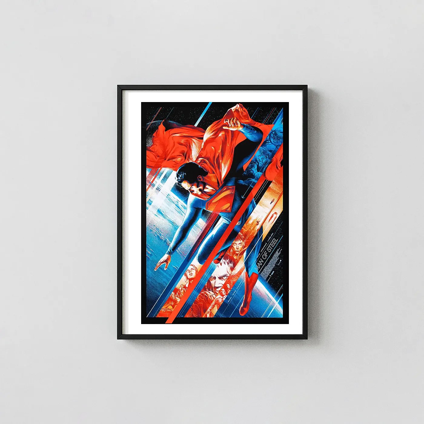 The design utilizes dynamic diagonal striping, slicing the canvas into areas of vibrant red and cool electric blue. Within these segments, key moments and figures from the film are interwoven—from the noble presence of Jor-El to the menacing gaze of General Zod and the determined spirit of Lois Lane. This composition beautifully visualizes the immense internal and external conflict Clark Kent faces as he embraces his destiny as Earth’s protector. This is more than just a movie poster; it is a high-art tribute to the Kryptonian hero’s enduring legacy and a must-have piece for any serious DC Comics collector or enthusiast of fine screen-printed movie memorabilia.