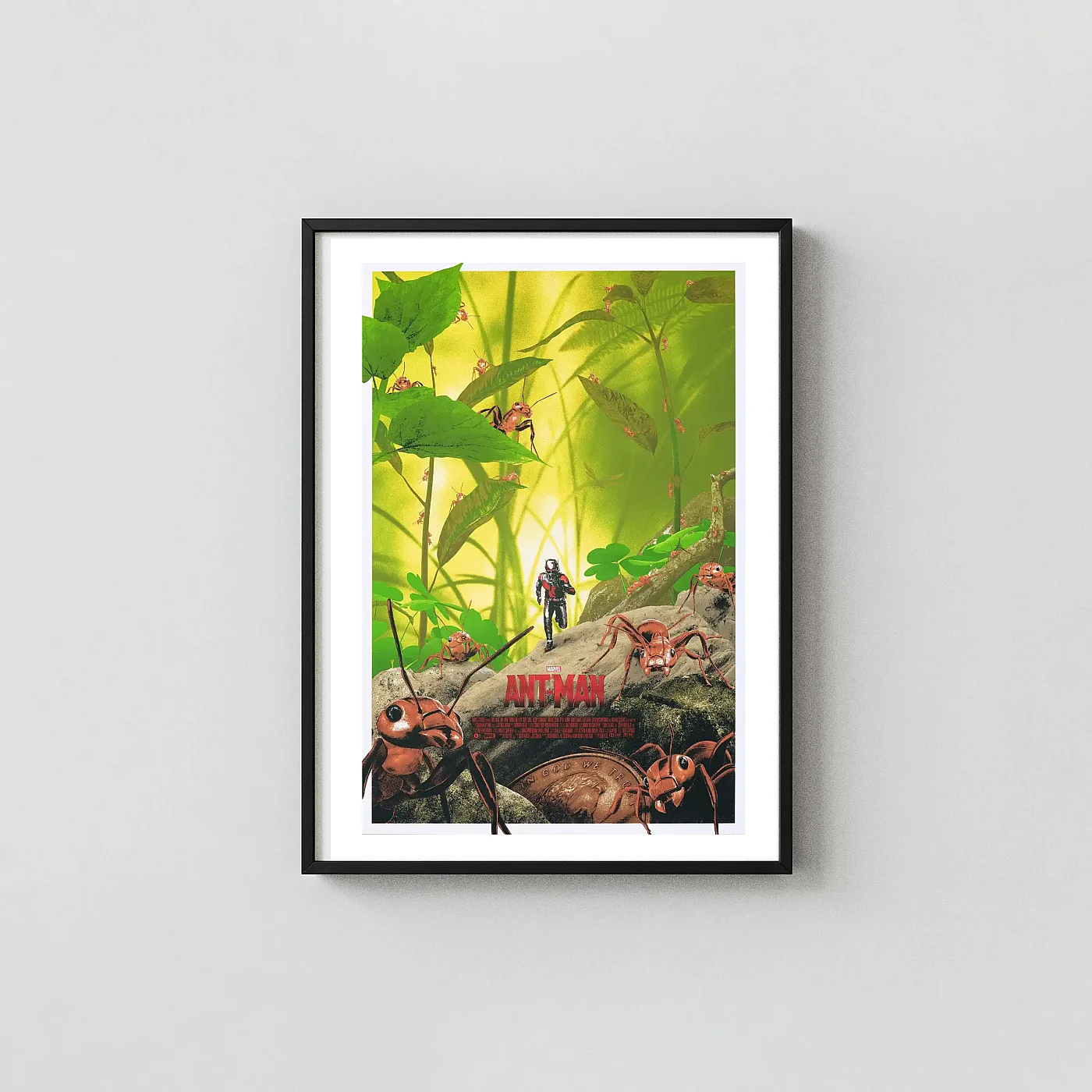 Immerse yourself in the microscopic world with this stunning Ant-Man variant movie poster art. Scott Lang runs across giant terrain, surrounded by his powerful ant allies. Essential Marvel Cinematic Universe collectible.