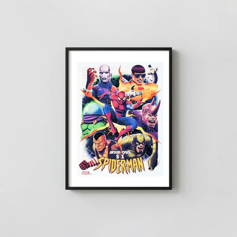 Experience the ultimate showdown! This vibrant, high-energy Marvel poster features Spider-Man battling Doctor Octopus, Rhino, Mysterio, Shocker, and the rest of his iconic rogues’ gallery, The Insidious Six.