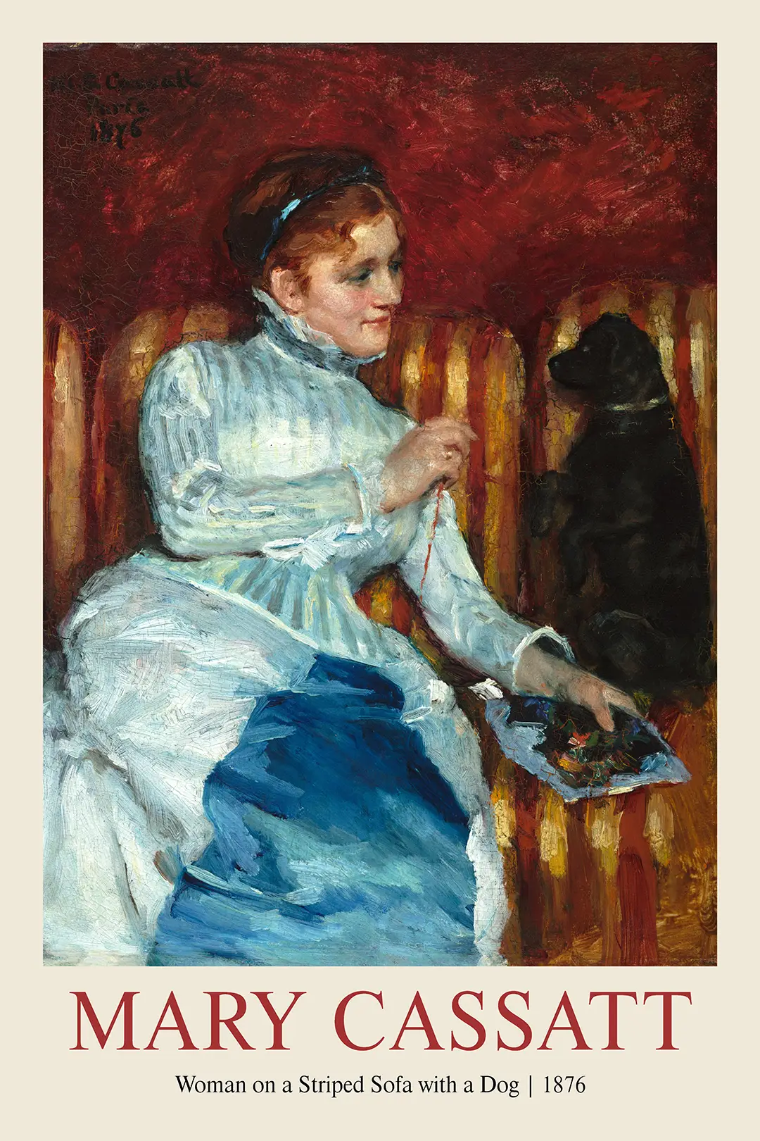 This Mary Cassatt art print captures the intimate domesticity of late 19th-century life through the lens of one of the most influential figures in the American Impressionist movement. Painted in 1876 during her formative years in Paris, this work depicts a woman in a high-collared, pale blue gown resting upon a sofa defined by bold yellow and ochre stripes. Beside her, a small black dog sits alertly, providing a sense of quiet companionship and life within the still interior. This reproduction offers a window into the private spheres that the artist famously explored throughout her career.