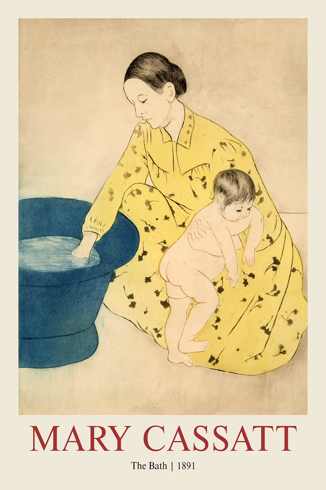 Mary Cassatt The Bath provides a glimpse into the private, domestic spheres that defined the career of this American Impressionist. Created in 1891, this work is a highlight of Cassatt’s famous series of ten color prints, which were heavily influenced by the Japanese woodblock prints she viewed at the École des Beaux-Arts in Paris. The composition utilizes flat planes of color and a distinct overhead perspective to capture a moment of quiet, maternal care. In this specific rendering, the muted yellow of the mother’s floral dress contrasts with the saturated blue of the ceramic basin, creating a balanced visual weight that anchors the room.