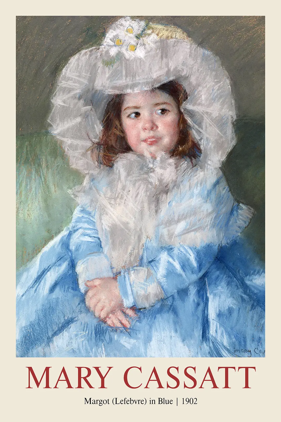 This Mary Cassatt print depicts Margot Lefebvre in a vibrant blue dress with a wide-brimmed floral bonnet. The Impressionist child portrait is rendered on museum-grade matte paper with archival inks for lasting color.