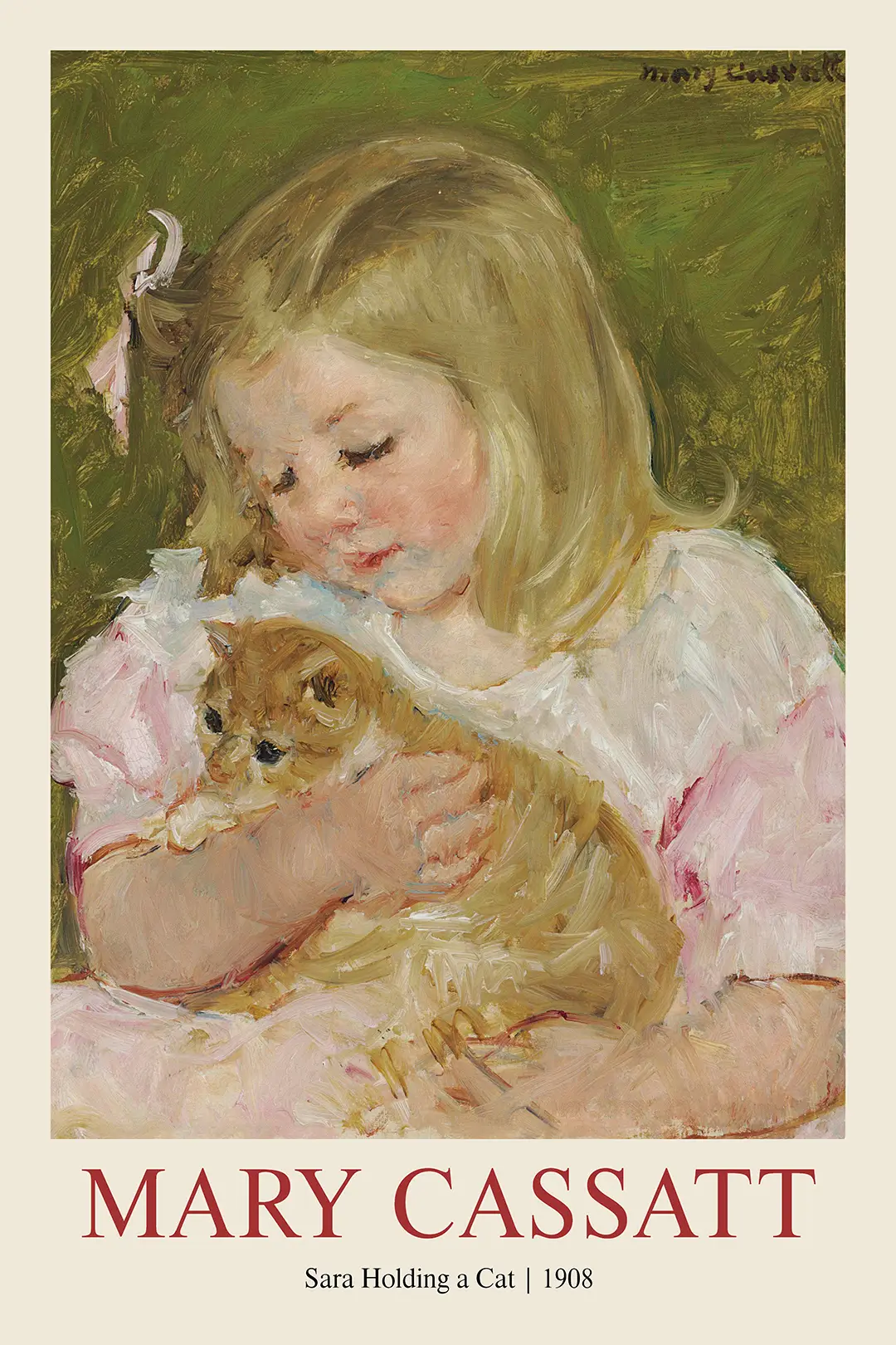 This Mary Cassatt Print features the 1908 oil painting of Sara cradling an orange kitten with expressive brushwork. Ideal for vintage nursery decor, this museum-grade matte poster brings American Impressionism home.