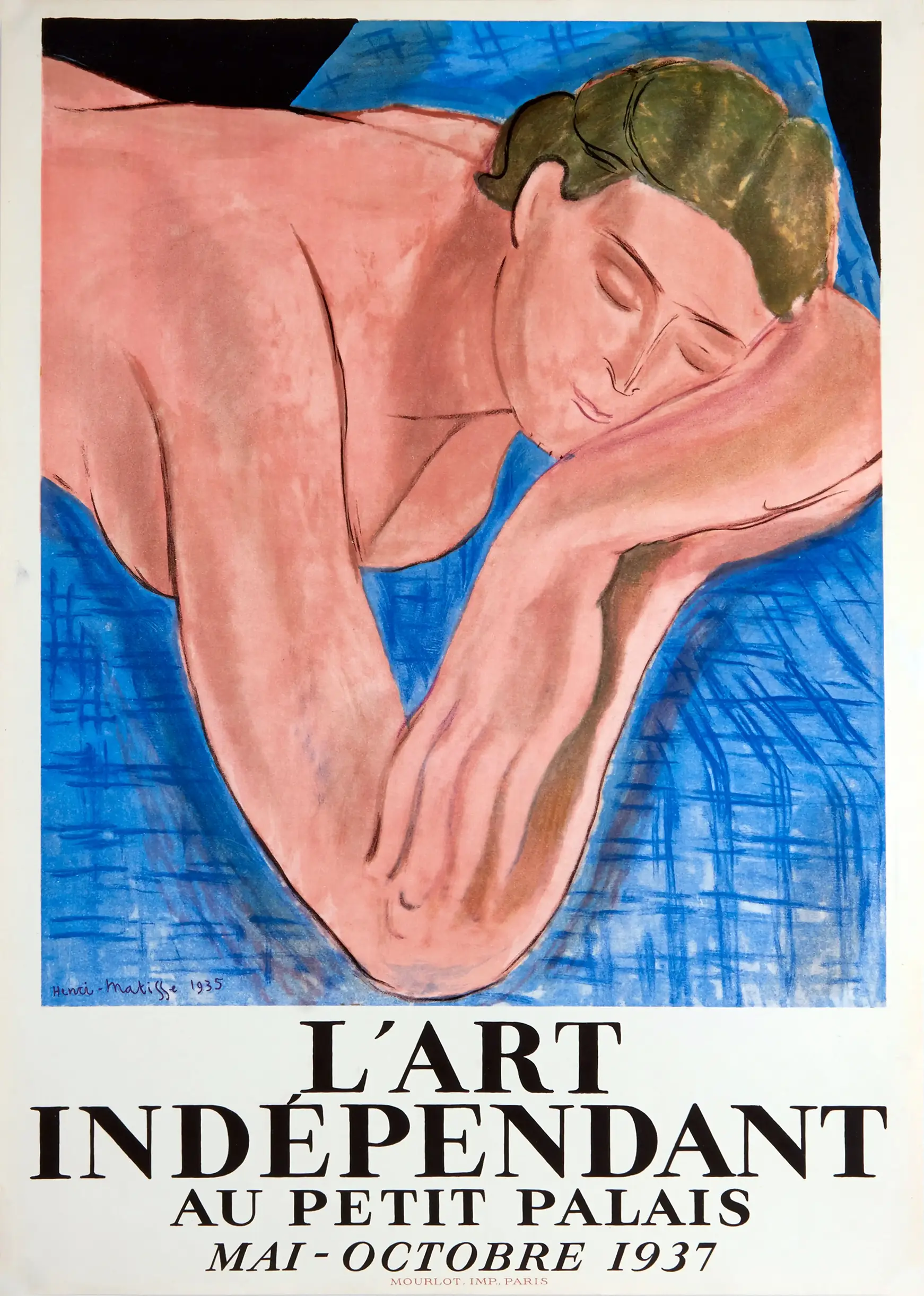 The “Exposition Internationale des Arts et Techniques dans la Vie Moderne” in 1937 saw Paris hosting a variety of groundbreaking showcases. Among these, L’Art Indépendant served as a defiance against conservative artistic norms. This Matisse exhibition poster represents the specific selection of works that challenged the status quo. The typography used at the bottom of the print—”L’Art Indépendant au Petit Palais, Mai-Octobre 1937″—is set in a heavy, classic serif font that provides a grounding architectural base to the fluid, organic forms of the illustration above. This archival reproduction maintains the exact spacing and font weight of the original announcement, preserving its period-accurate character.