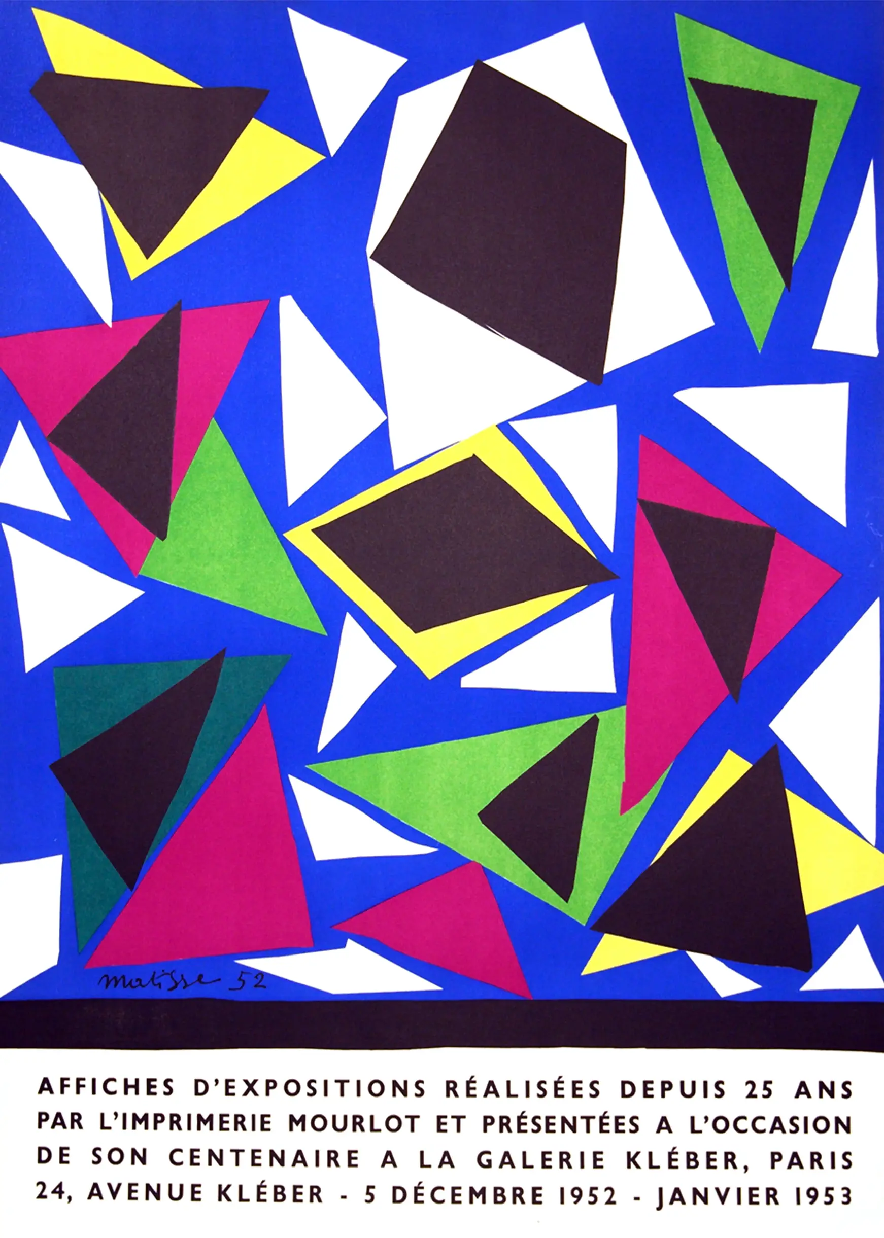 The history of the Matisse exhibition poster is inextricably linked to the Mourlot brothers, who revitalized the art of lithography in the 20th century. Mourlot became the preferred printer for the leading figures of modernism, and this centenary print serves as a visual index of that fruitful collaboration. Unlike his earlier organic figures, this particular design focuses on aggressive geometry and high-contrast overlaps. The black trapezoids anchor the more vibrant triangles, providing a structural weight that balances the lighter white paper fragments. Collectors of mid-century modern art often seek this Matisse exhibition poster because it captures the energetic experimentation of the artist’s final years in Nice.