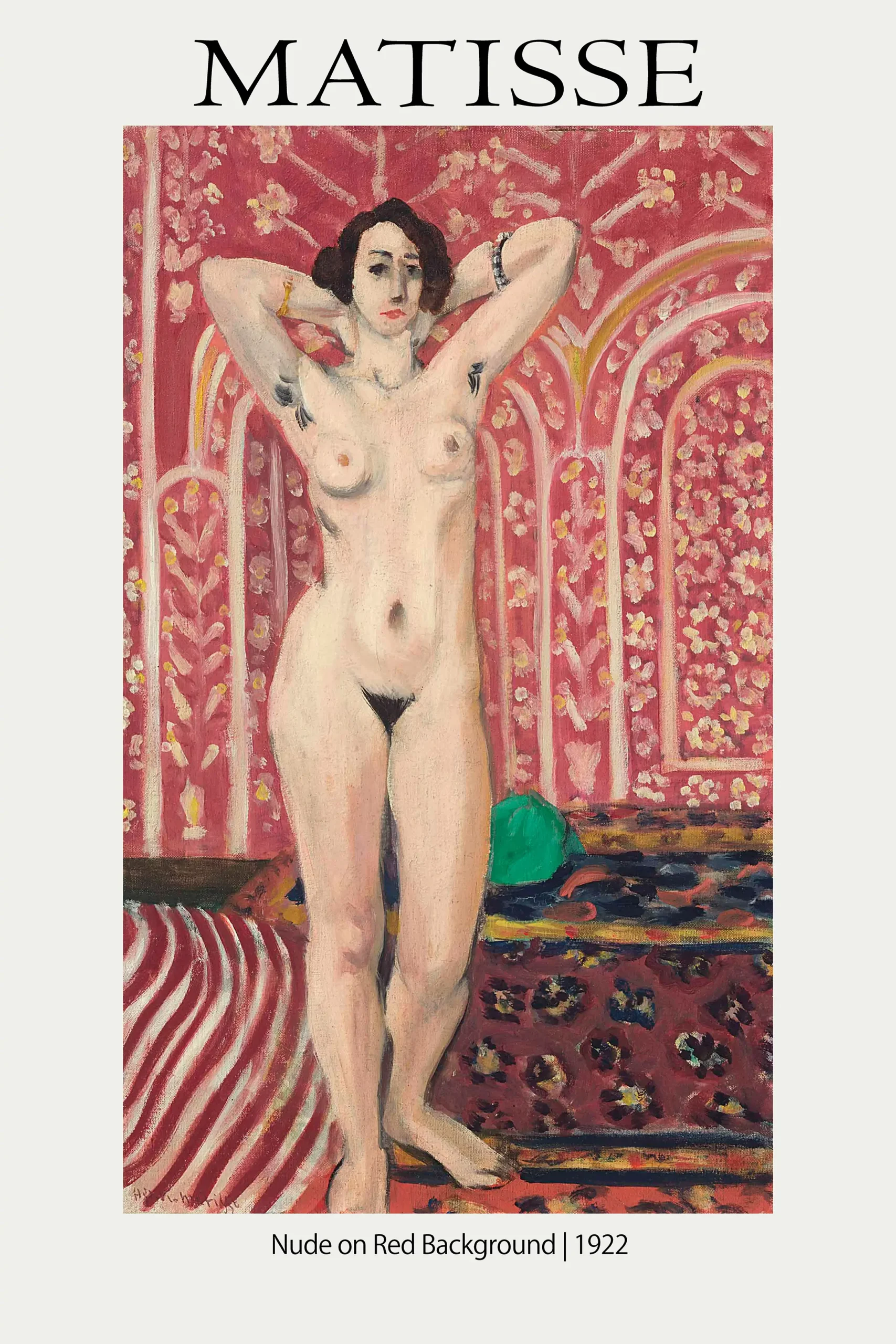 In 1922, Matisse was deeply invested in exploring how decorative patterns could interact with the three-dimensional presence of a model. Unlike his earlier, more minimalist Fauvist works, this period involved a more complex layering of visual elements. The Matisse exhibition poster highlights his use of a monochromatic red palette for the wallpaper, broken only by the pale yellow and pink floral arches that create a sense of architectural depth without traditional perspective. This transition is vital for understanding the development of modern art, making the print a necessary addition for those interested in the evolution of French painting. The contrast between the organic lines of the nude and the rigid, yet vibrating, patterns of the room creates a visual tension that defines his mid-career style.