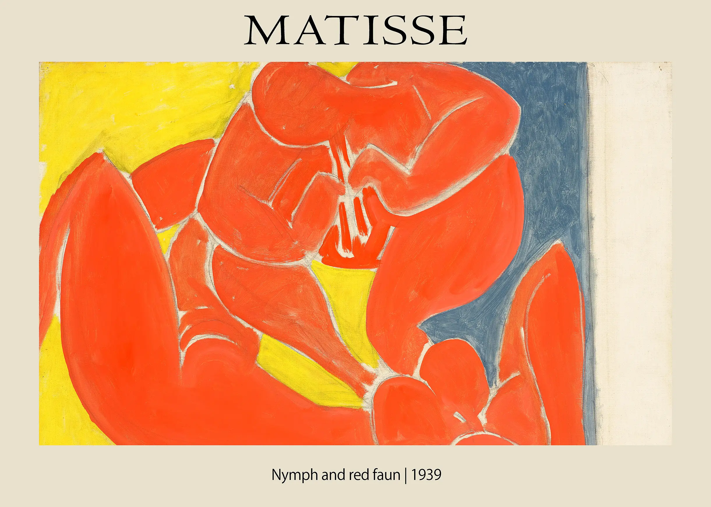 This Matisse exhibition poster showcases the 1939 work Nymph and Red Faun in bold cadmium reds and ultramarine blues. This Fauvism wall art decor is printed on 200 GSM museum-grade matte paper for a flat finish.