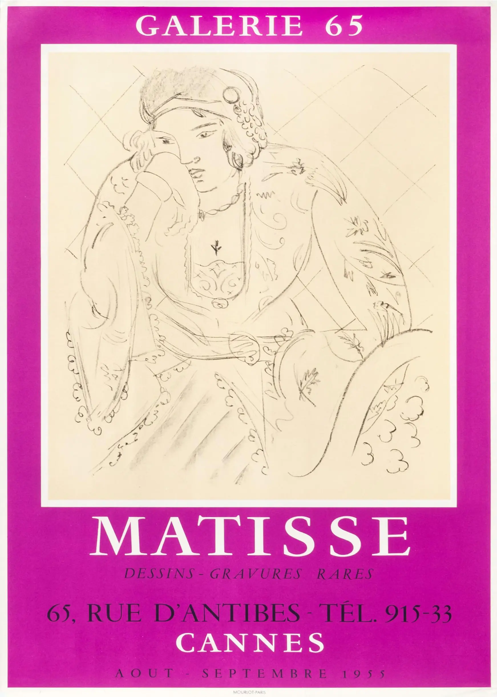 Matisse Galerie 65 poster serves as a primary example of mid-century French lithographic promotion, capturing the essence of the 1955 exhibition in Cannes. This specific print, titled Dessins – Gravures Rares, highlights the late-career brilliance of Henri Matisse, focusing on his ability to convey form and emotion through simplified, elegant line work. The central figure is a woman depicted in a relaxed pose, wearing a patterned garment that suggests an orientalist influence, a recurring theme throughout the artist’s prolific career. The sketch is surrounded by a bold magenta frame that provides a sharp, colorful contrast to the cream-colored interior and the delicate black ink of the drawing.