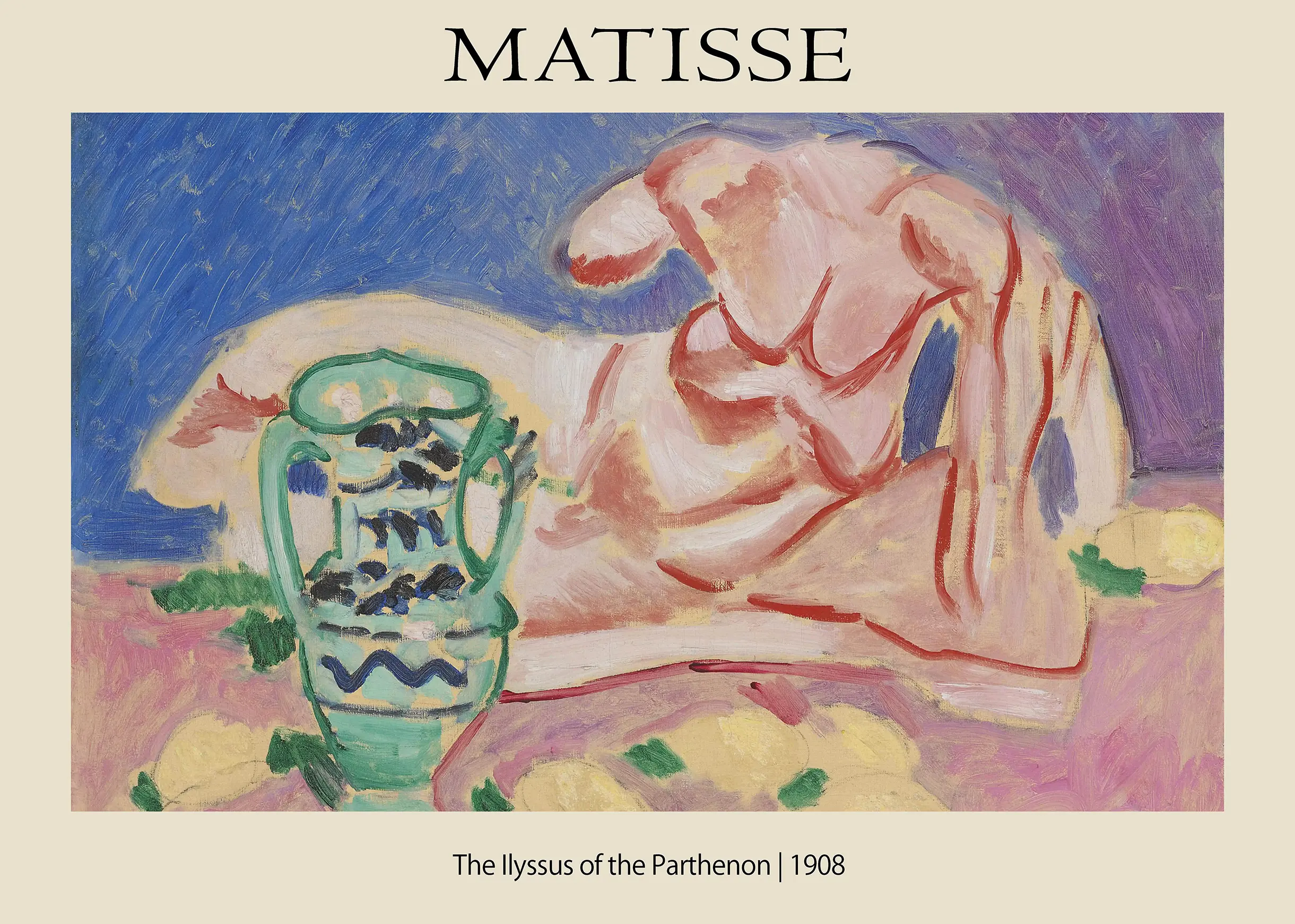 In this composition, the figure lies in a relaxed, almost heavy posture that dominates the horizontal axis of the frame. The heavy outlines and blocks of color demonstrate the ‘Wild Beast’ style that defined the early 20th-century avant-garde. To the left, a green vase with dark blue ornamentation provides a decorative anchor, contrasting with the more abstract rendering of the human form. For collectors of modern french exhibition print styles, this piece represents the intersection of antiquity and the modern age, making it a sophisticated addition to any gallery wall. The Matisse Ilyssus Print does not merely document a sculpture; it reinvented the way viewers perceive physical mass through the lens of pure pigment.