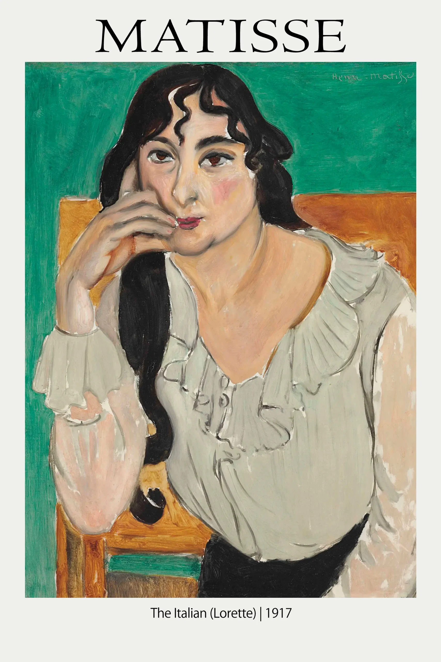 The Matisse Italian Lorette serves as a definitive example of Henri Matisse’s transition toward a more structured yet color-expressive style during the First World War era. Painted in 1917, this portrait of the model Laurette captures a somber, meditative mood through bold color blocking and thick, confident brushwork. This specific reproduction maintains the integrity of the original oils, displaying the contrast between the rich emerald green backdrop and the warm, earthy tones of the wooden chair and the subject’s skin.