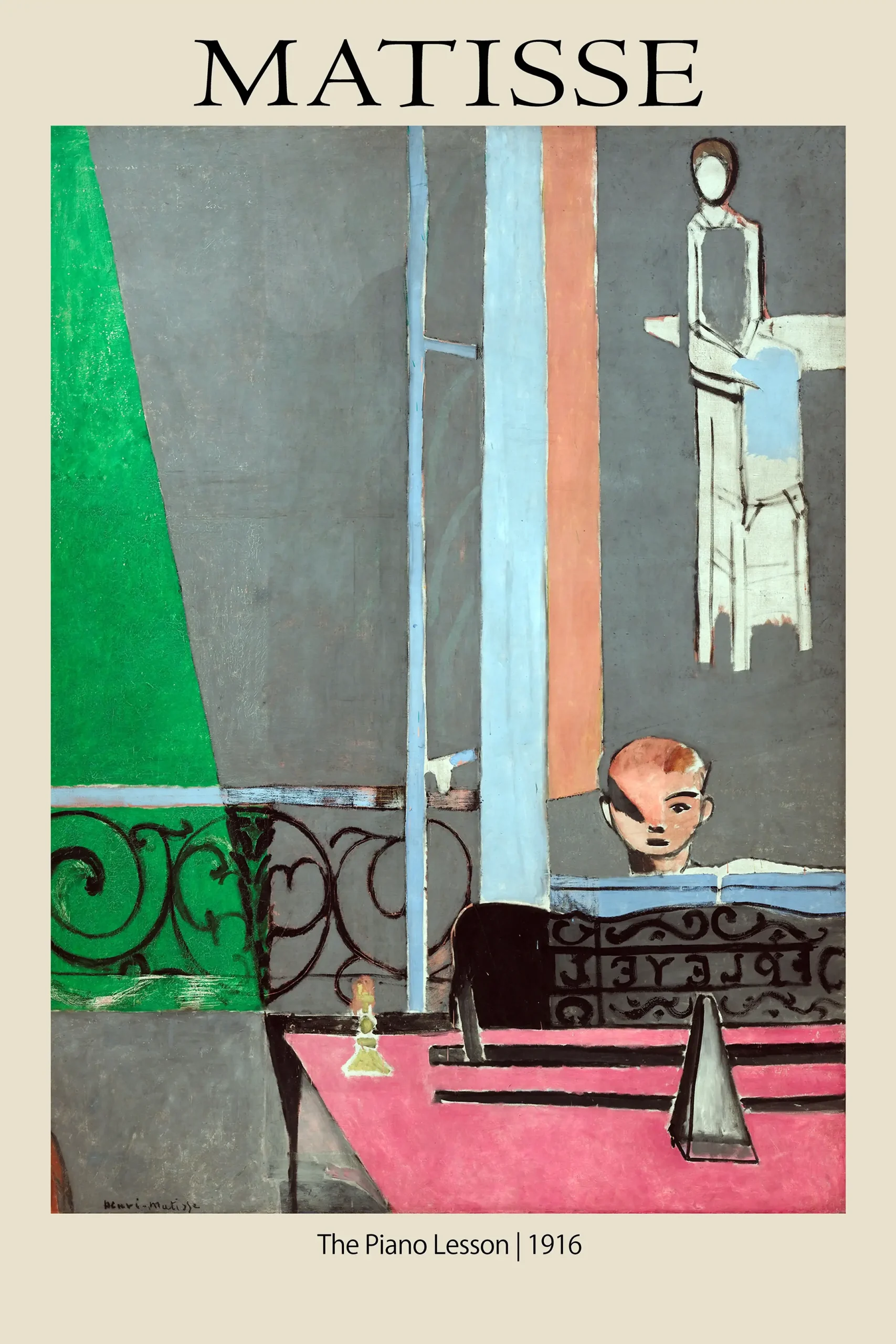 The Matisse Piano Lesson depicts the artist’s son Pierre practicing at a Pleyel piano in a highly structured, geometric interior. This 1916 modern art poster is printed on museum-grade matte paper for a professional gallery finish.