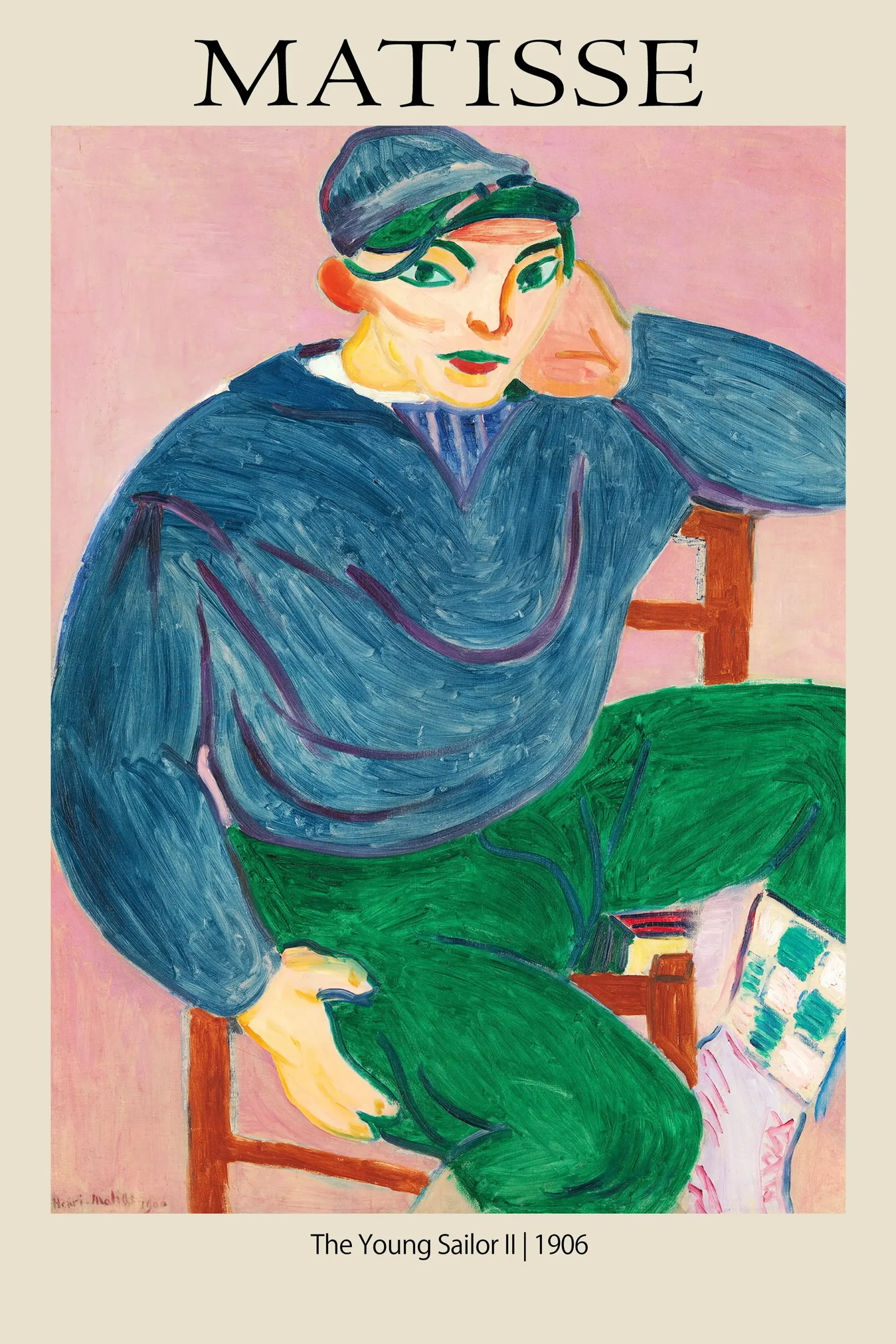 The composition of the Matisse Sailor print is strikingly modern. The young man’s posture is relaxed yet alert, his gaze fixed forward with a sense of youthful confidence. The heavy green outlines around the eyes and face are characteristic of Matisse’s experimental phase, where color was used not just to fill space but to construct the very anatomy of the subject. The chair upon which he sits is reduced to basic brown lines, providing a structural anchor to the composition without distracting from the central figure. This balance of simplicity and intensity makes the Henri Matisse Fauvism poster an ideal focal point for contemporary interiors that value bold, graphic design and historical depth.