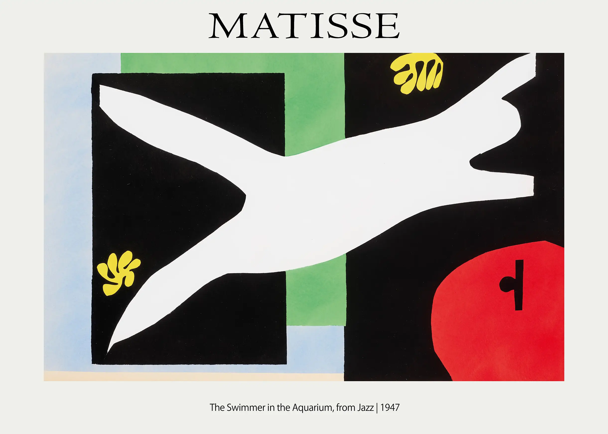 Historically, the Matisse Swimmer print is more than a simple decorative element; it is a study in color theory and spatial relationships. The composition is anchored by a vertical green band and accented by blue rectangular forms that suggest the presence of glass or water boundaries. To the right, a bold red circular form with a black notch adds a grounding weight to the visual balance, while small yellow organic shapes, reminiscent of sea flora or algae, float in the periphery. This work was originally created using hand-painted sheets of paper, which were then cut with shears and pinned to the walls of Matisse’s studio. This reproduction captures the hard-edge precision and organic curves of those original hand-cut forms.