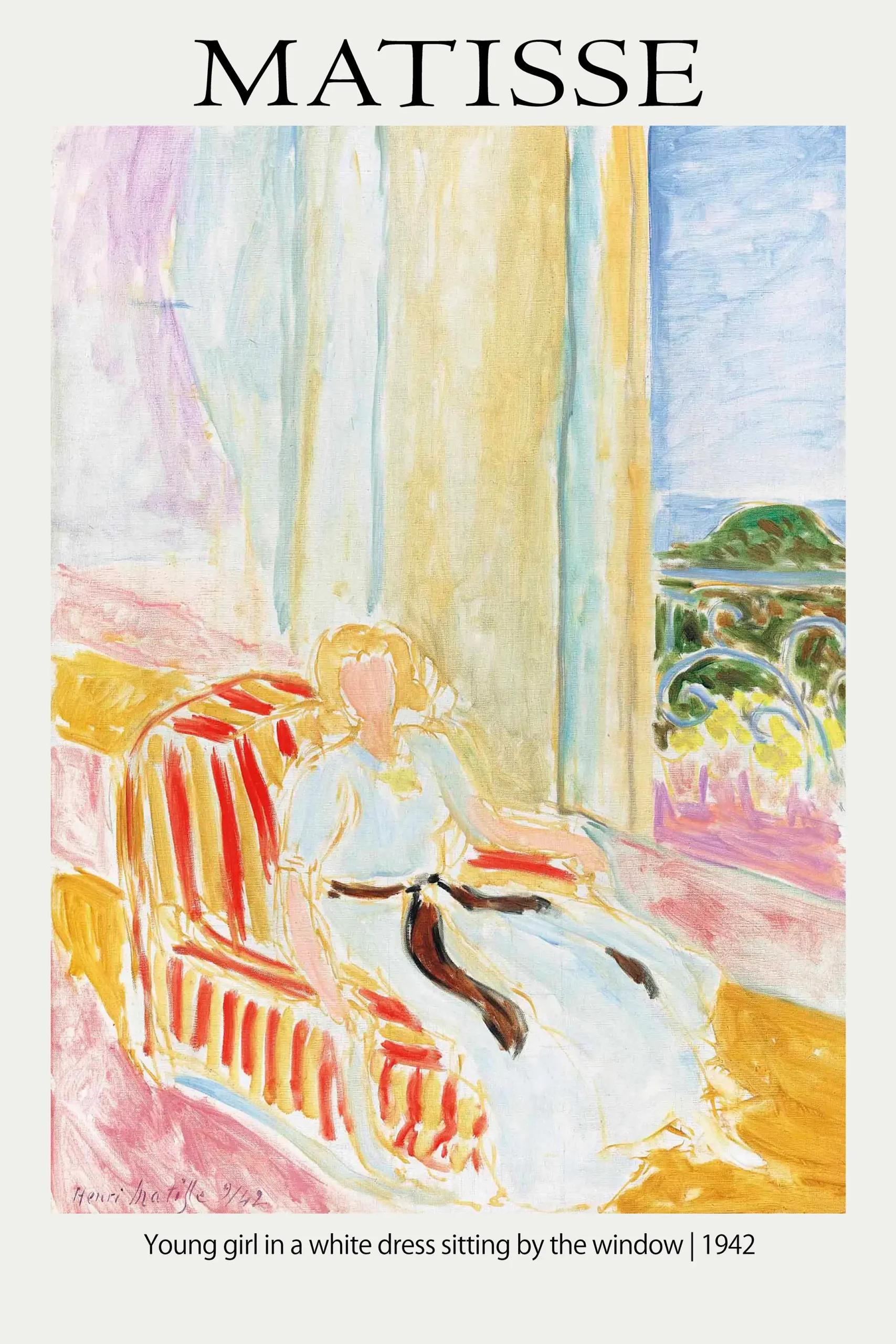 Matisse window print features a young girl seated in a red-striped armchair against a luminous Mediterranean backdrop. This vintage museum exhibition poster is produced using fade-resistant archival inks on 200 GSM paper.